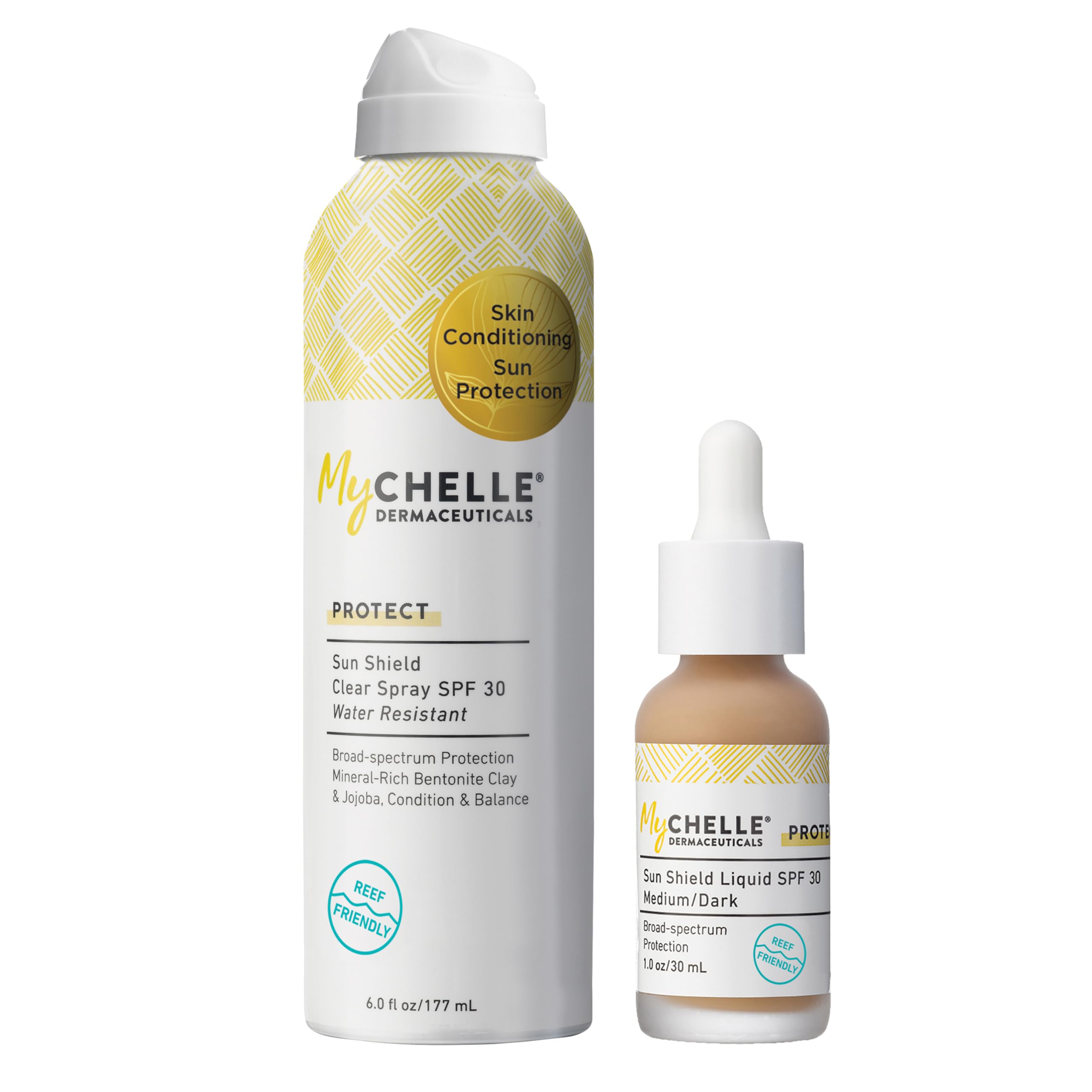 MYCHELLE PROTECT: Our sun care collection is designed to protect your skin against premature aging symptoms through a broad-spectrum formula This reef safe zinc sunscreen keeps you sun-safe year round. USE DAILY: Apply sunscreen liberally and evenly 15 minutes before sun exposure Reapply sunscreen after 80 minutes of swimming or sweating, immediately after towel drying, or at least every 2 hours. CLEAN INGREDIENTS: Does not contain retinyl palmitate or chemical UV absorbers including octinoxate, octisalate, oxybenzone, or PABA Made without parabens, petroleum, phthalates, silicones, sulfates, ureas, artificial fragrances, and artificial colors. MYCHELLE SUNSCREEN: SPF Broad-spectrum formula to keep out UVA and UVB rays This MyCHELLE sunscreen formula offers water-resistance for various activities. 2 PACK: Bundle of Sun Shield SPF 30 Spray, and Sun Shield 30 Liquid in Medium Dark shade.
