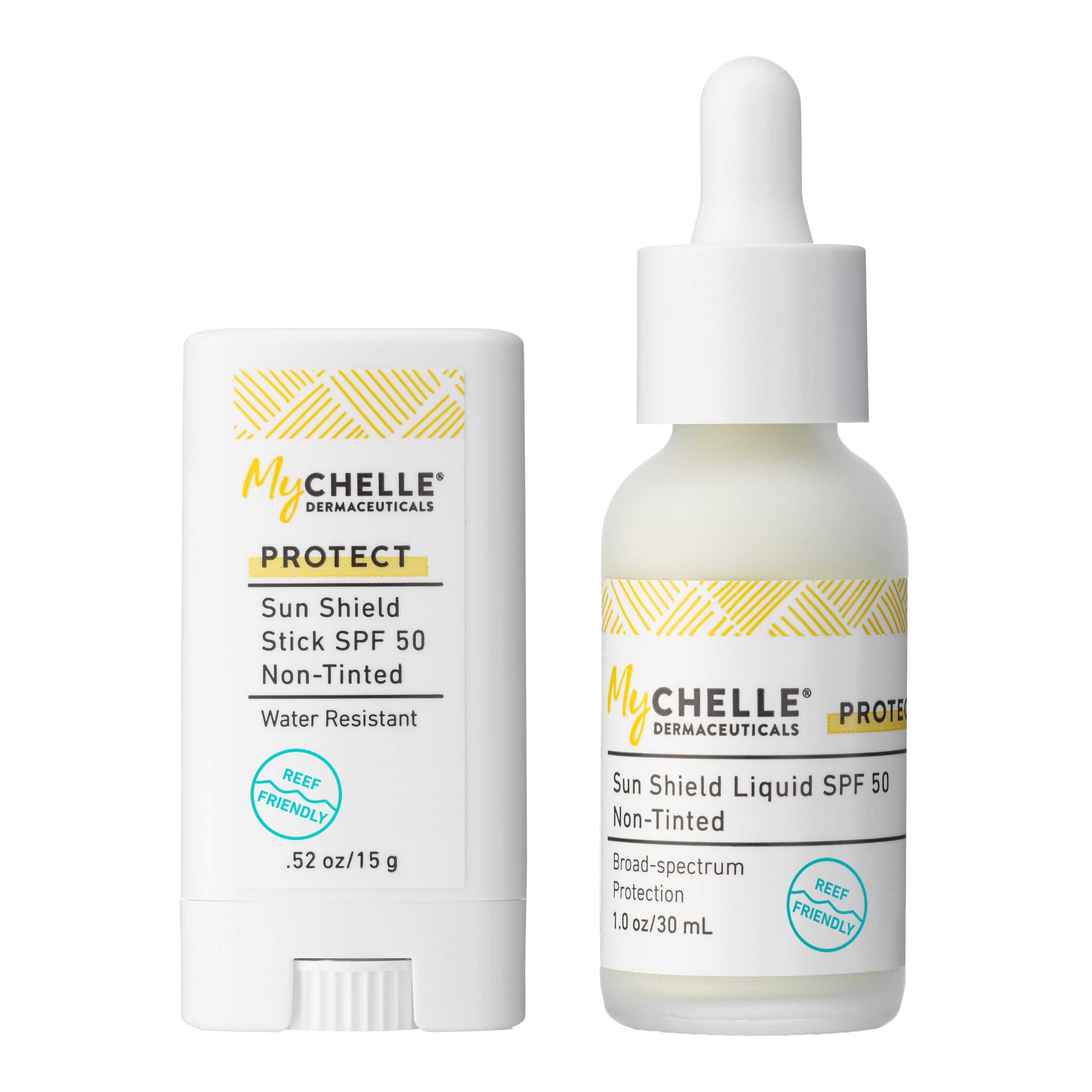 MYCHELLE PROTECT: Our sun care collection is designed to protect your skin against premature aging symptoms through a broad-spectrum formula This reef safe zinc sunscreen keeps you sun-safe year round. USE DAILY: Apply sunscreen liberally and evenly 15 minutes before sun exposure Reapply sunscreen after 80 minutes of swimming or sweating, immediately after towel drying, or at least every 2 hours. CLEAN INGREDIENTS: Does not contain retinyl palmitate or chemical UV absorbers including octinoxate, octisalate, oxybenzone, or PABA Made without parabens, petroleum, phthalates, silicones, sulfates, ureas, artificial fragrances, and artificial colors. MYCHELLE SUNSCREEN STICK and LIQUID: An SPF 50, broad-spectrum formula to keep out UVA and UVB rays This MyCHELLE sunscreen formula offers water-resistance for various activities.