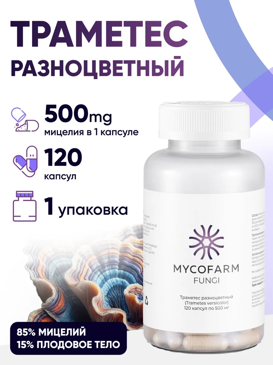 Траметес (Trametes versicolor) от Mycofarm Fungi — это ваш надежный помощник в поддержании здоровья и общего благополучия. Попробуйте и почувствуйте естественную силу природы!