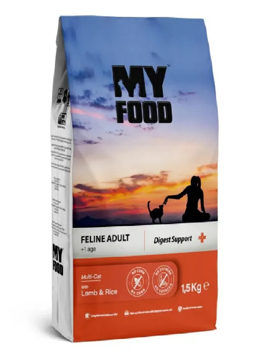 Myfood, Dry Food for Adult Cats with Chicken, 1.5 kg. Myfood Feline Adult Multi-Cat with Lamb & Rice is a complete dry food for adult cats with lamb and rice. Formulated specifically for daily nutrition. Nutrition is crucial for maintaining a healthy and high-quality life for your feline friends. When selecting protein and grain sources, we took into account the digestive system of our pets and, accordingly, included the most beneficial nutrients.