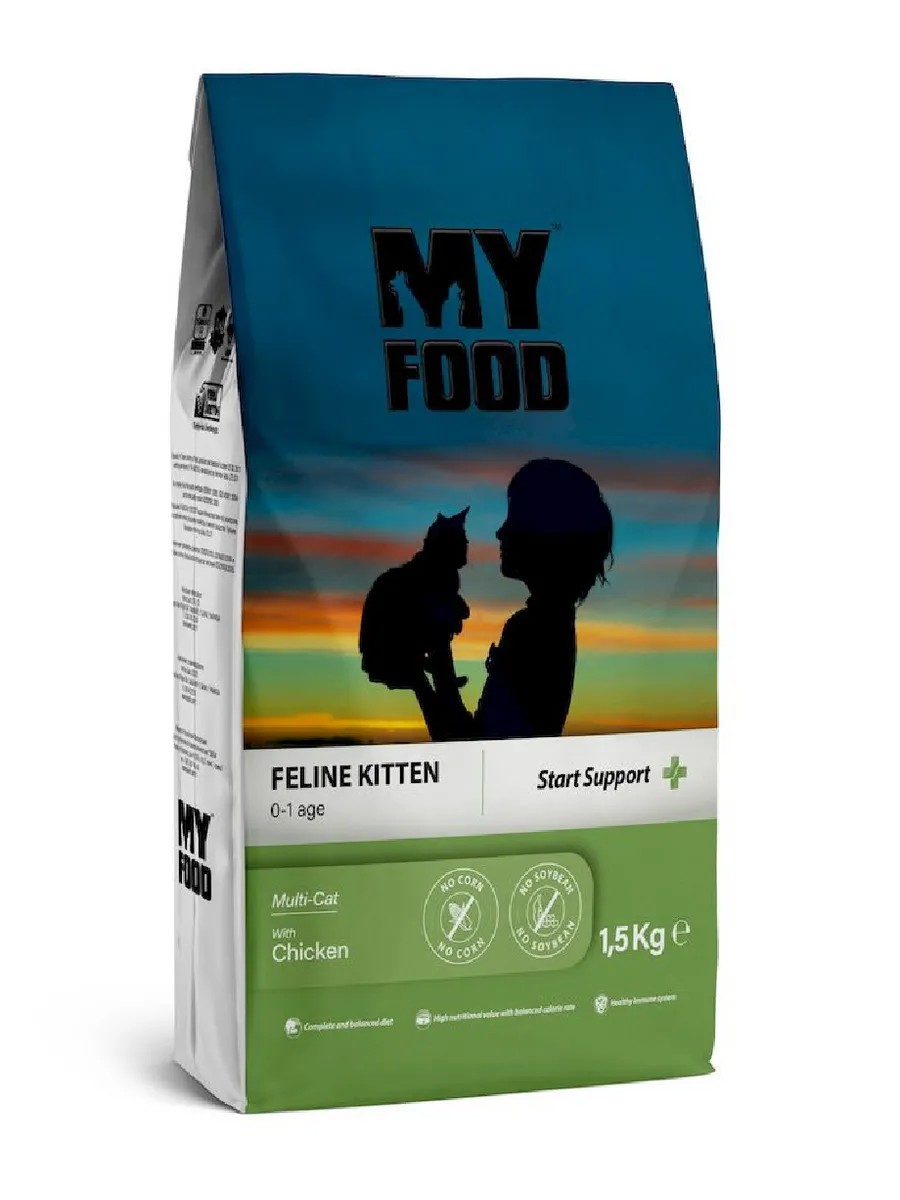 Myfood, Сухой корм для котят с курицей, 1.5 кг. Полнорационный сухой корм для котят с курицей My food — это корм, который котята будут есть с удовольствием. Он производится из свежего мяса в сыром виде по уникальной технологии (FMIS). Это корм превосходного качества, приготовленный с использованием высококачественного свежего мяса курицы, сушеных овощей и фруктов, а также добавок из свежих продуктов. Питание чрезвычайно важно для поддержания здоровой и качественной жизни ваших друзей-питомцев. При выборе источников белка и злаков учитывалась особенность пищеварительной системы наших домашних питомцев, и, соответственно, были включены наиболее полезные питательные вещества.Myfood