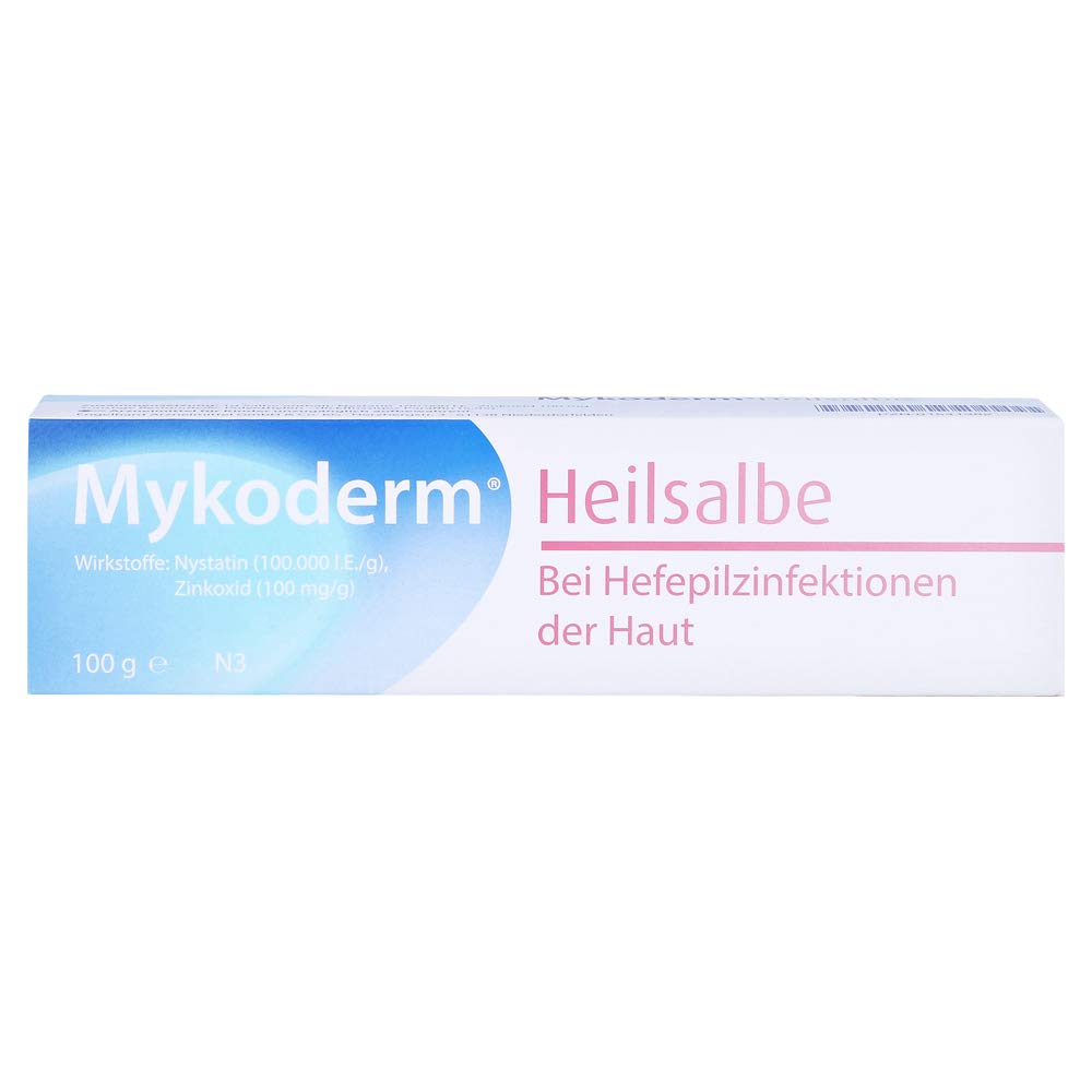 Ingredients: active ingredient each 1 g ointment: 100,000 i.e. Nystatin 100 mg zinc oxide Other components: polyethylene, viscous paraffin;Apply ointment 2-3 times a day-in the morning, (at noon) and in the evening-to the sick skin areas;For infants up to 4 times a day, each before changing. Ingredients / ingredients Active ingredient each 1 g ointment: 100,000 i.e. Nystatin 100 mg zinc oxide Other components: polyethylene, thick -fluid paraffin Instructions Apply ointment 2-3 times a day-in the morning, (at noon) and in the evening-to the sick skin areas;For infants up to 4 times a day, each before changing. Warnings For successful treatment, it is important to apply the preparation for a long time.However, if the treatment is unsuccessful, please ask for medical advice. LEGAL NOTICE You ask your doctor or pharmacist about risks and side effects. More on risks and side effects Read the package supplement and ask your doctor, your doctor or in your pharmacy.This product must not be handed over to people under the legal minimum age.This product must not be handed over to people under the legal minimum age.Pharmacy.100 g ointment.PZN-01541382. Zutaten:Wirkstoff je 1 g Salbe:100.000 I.E. Nystatin 100 mg Zinkoxid Sonstigen Bestandteile: Polyethylen, dickflüssiges Paraffin; Salbe 2-3 mal täglich – morgens, (mittags) und abends – auf die erkrankten Hautpartien auftragen; bei Säuglingen bis zu 4 mal täglich, jeweils vor dem Wickeln.Die Salbe sollte minimal 1 Woche, durchschnittlich 2-4 Wochen, bei Bedarf auch länger angewendet werden. INHALTSSTOFFE / ZUTATEN Wirkstoff je 1 g Salbe:100.000 I.E. Nystatin 100 mg Zinkoxid Sonstigen Bestandteile: Polyethylen, dickflüssiges Paraffin GEBRAUCHSANWEISUNG Salbe 2-3 mal täglich – morgens, (mittags) und abends – auf die erkrankten Hautpartien auftragen; bei Säuglingen bis zu 4 mal täglich, jeweils vor dem Wickeln.Die Salbe sollte minimal 1 Woche, durchschnittlich 2-4 Wochen, bei Bedarf auch länger angewendet werden. WARNHINWEISE Für eine erfolgreiche Behandlung ist es wichtig, das Präparat ausreichend lange anzuwenden. Bleibt die Behandlung jedoch erfolglos, so fragen Sie bitte um ärztlichen Rat. RECHTLICHE HINWEISE Zu Risiken und Nebenwirkungen fragen Sie Ihren Arzt oder Apotheker. MehrZu Risiken und Nebenwirkungen lesen Sie die Packungsbeilage und fragen Sie Ihre Ärztin, Ihren Arzt oder in Ihrer Apotheke. Dieses Produkt darf nicht an Personen unter dem gesetzlichen Mindestalter abgegeben werden. Dieses Produkt darf nicht an Personen unter dem gesetzlichen Mindestalter abgegeben werden. apothekenpflichtig. 100 g Salbe. PZN-01541382.MYKODERM Heilsalbe Nystatin u.Zinkoxid 100 g
