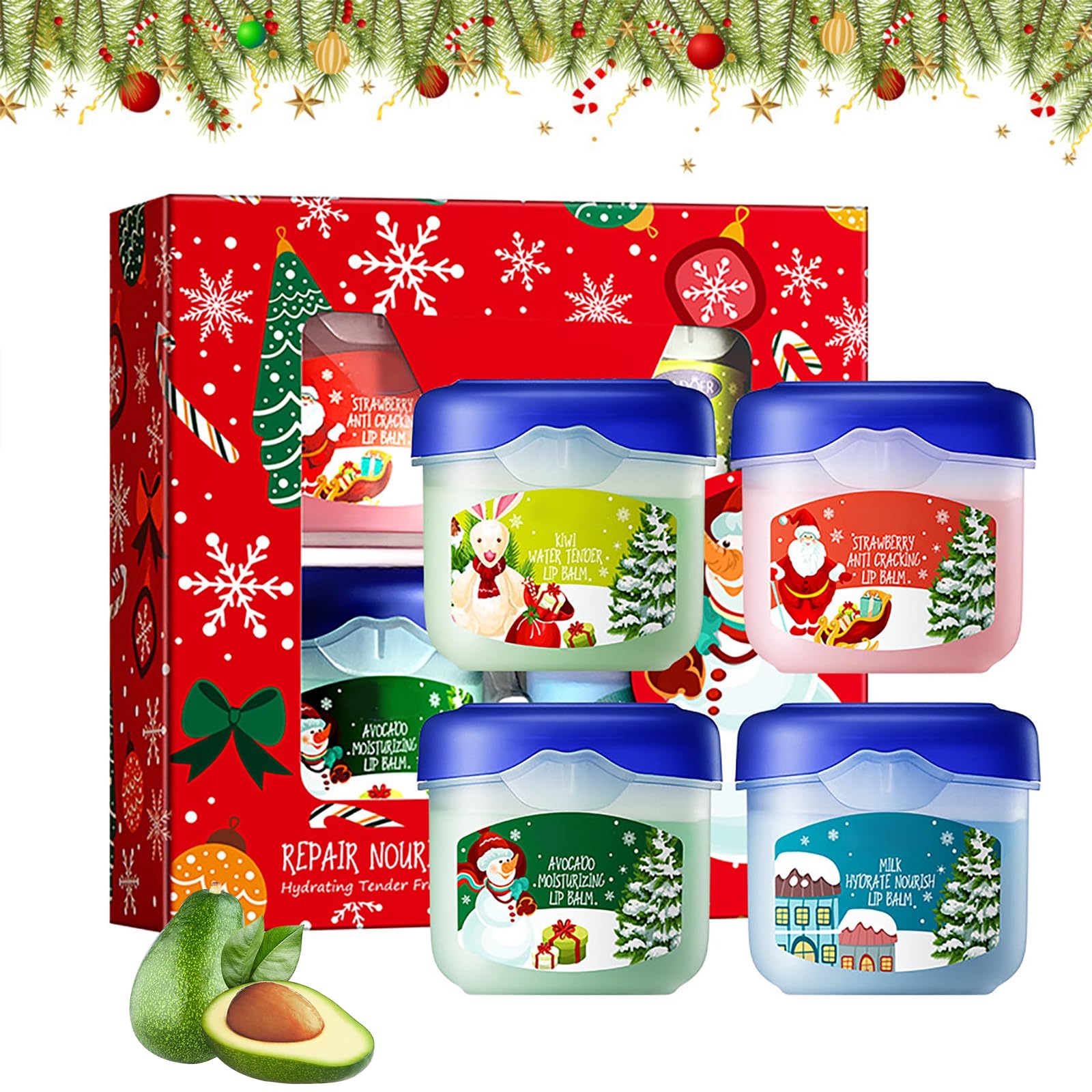 Hydrating Lip Balm Set, Christmas Natural Moisturizing Lip Balm, Lip Care, Intense Hydration to Soothe Dry and Cracked Lips - (7g x 4 pieces) SAFETY WARNING NoSmall gift: A perfect little gift for teens or adults. Available in a wide range of colors and scents, this lip balm is the perfect lip balm (Savour: Avocado Moisturizing Balm 7g - Strawberry Anti-Crack Lip Balm 7g - Milk Moisturizing Nourishing Lip Balm 7g - Kiwi Moisturizing Lip Balm 7g). Day and night repair: Apply the lip balm thinly during the day for long-lasting hydration and before makeup for a flattering base. Apply liberally at night before bed to repair, exfoliate, deeply nourish, and reduce lip wrinkles overnight. With long-term use, lips are consistently moisturized and repaired. Prevents dry and chapped lips: This lip balm safely and effectively prevents dry, chapped, cracked, and wrinkled lips. If you are exposed to cold winds for extended periods, your sensitive lips can become dry, cracked, and damaged. Treating your lips with a lip balm prevents dryness, chapping, and cracking, and repairs dry and chapped areas to restore your lips to a healthy, natural state. Moisturizing and hydrating: This lip balm provides all-day hydration. Its formula contains moisturizing agents that plump the lips, nourish the skin, and effectively improve lip wrinkles. Lip balm set: This set contains four different lip balms, each with a unique taste and color, different scents to suit different moods, subtle fragrances, and a clear, moist, and glossy finish on the lips after application.Hydrating Lip Balm Set, Noël Baume à lèvres hydratant naturel, soin des lèvres, hydratation intense pour apaiser les lèvres sèches et fissurées - (7 g x 4 pièces)DESCRIPTION DU PRODUIT DESCRIPTION DU PRODUIT Hydrating Lip Balm Set, Noël Baume à lèvres hydratant naturel, soin des lèvres, hydratation intense pour apaiser les lèvres sèches et fissurées - (7 g x 4 pièces) AVERTISSEMENT DE SÉCURITÉ NonPetit cadeau : un petit cadeau idéal pour les adolescents ou les adultes. Composé d'une large gamme de couleurs et d'arômes, ce baume à lèvres est le baume à lèvres parfait (Savor : baume hydratant à l'avocat 7 g - Baume à lèvres anti-crack à la fraise 7 g - Baume à lèvres nourrissant hydratant au lait 17 g - Baume à lèvres hydratant Kiwi 7 g). Réparation jour et nuit : appliquez le baume à lèvres finement pendant la journée pour obtenir un effet hydratant durable et appliquez-le avant le maquillage pour obtenir une base flatteuse. Appliquer grossièrement le soir avant le coucher pour réparer, exfolier, nourrir en profondeur et réduire les rides des lèvres pendant la nuit. Avec une utilisation à long terme, les lèvres sont hydratées et réparées régulièrement. Prévient les lèvres sèches et gercées : ce baume à lèvres prévient en toute sécurité et efficacement les lèvres sèches, gercées, sèches et ridées. Si vous êtes exposé à des vents froids pendant de longues périodes, vos lèvres sensibles peuvent se dessécher, se fissurer et s'abîmer. Traiter vos lèvres avec un baume à lèvres prévient les lèvres sèches, gercées et gercées et répare les zones sèches et gercées pour restaurer vos lèvres à un état sain et naturel. Hydratant et hydratant : ce baume à lèvres hydrate tout au long de la journée. Sa formule contient des facteurs hydratants qui remplissent les lèvres, nourrissent la peau et améliorent efficacement les rides des lèvres. Ensemble de baumes à lèvres : ce lot de baumes à lèvres contient 4 baumes à lèvres différents, chacun avec un goût et une couleur uniques, différents parfums qui représentent différentes humeurs, des parfums subtils et un aspect clair, humide et brillant sur les lèvres après l'application.