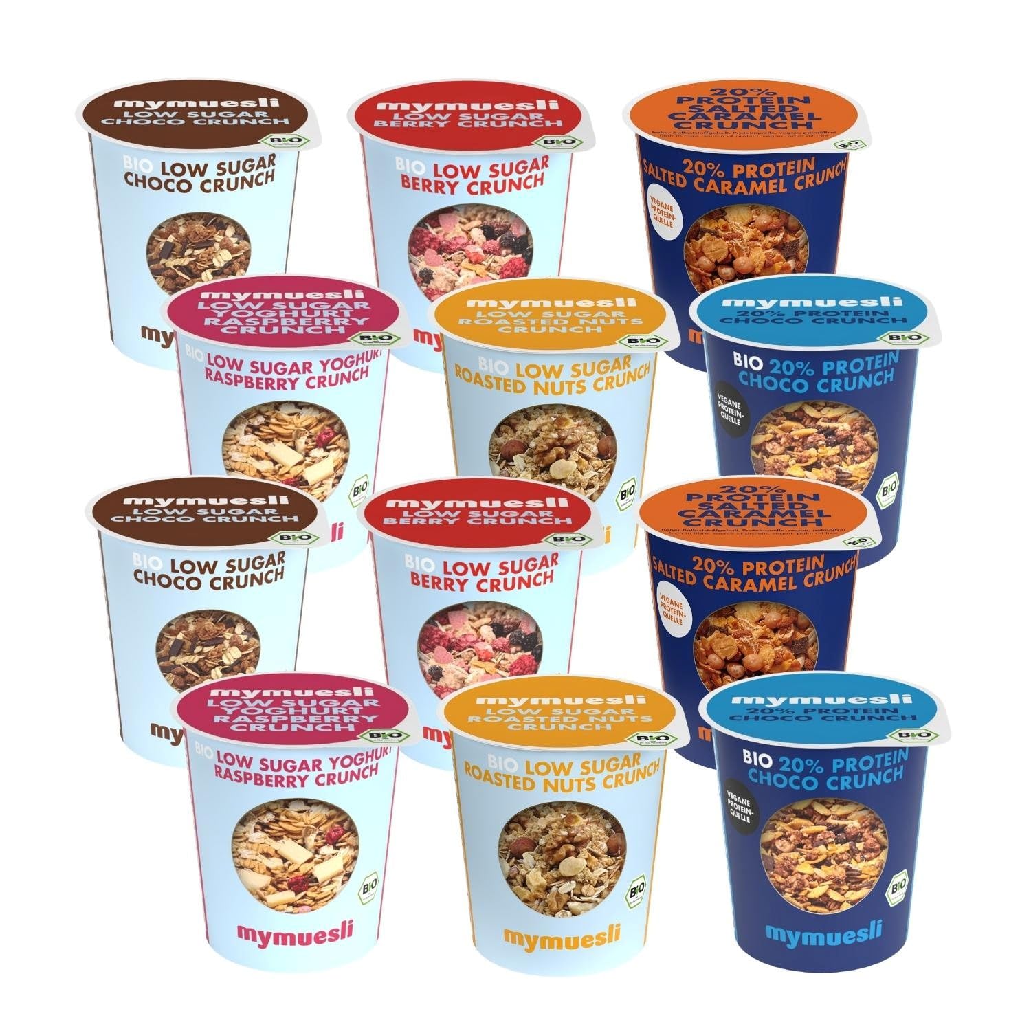 Low-sugar, vegan, high-protein, and high-fiber, with 2 cereals with proven micronutrients , pleasantly fruity, nutty, and even chocolate flavors. 2 x mymuesli2go Fit in Shape Cashew Raspberry, 2 x mymuesli2go Fit in Shape Strawberry Banana, 2 x mymuesli2go 20 Protein Chocolate Crunch, 2 x mymuesli2go 20 Protein Berry Crunch, 2 x mymuesli2go Low Sugar Berry Crunch, 2 x mymuesli2go Low Sugar Chocolate Crunch. All organic and palm oil-free. Simply remove the lid, add milk, and stir! INGREDIENTS Choco Crunch Protein: Chocolate crispy pieces (43 ) (oat flakes, raw cane sugar, sunflower oil, wheat flakes, rice flour, cocoa mass, coconut grating, cocoa powder, rice syrup, cocoa butter, barley malt flour, sea salt ), soy flakes (35 ), puffed oat crispy pieces. Spelt (whole grain oat flakes, tapioca syrup, sunflower oil, chicory root fiber, drenched spelt wheat, puffed spelt in dark coconut sugar (cocoa mass, coconut blossom sugar, cocoa butter, corn semolina, spelt wheat flour, rice syrup, sea salt ), bittersweet chocolate chips (5 ) (cocoa mass, raw cane sugar, cocoa butter). May contain traces of nuts, peanuts, lupin, sesame seeds, and milk. INSTRUCTIONS FOR USE Remove the lid, add milk, and enjoy the cereal directly in your cup. MANUFACTURER'S DETAILS mymuesli AG, Sailerwöhr 16, 95032, Passau, Germany See moremymuesli Lot de 12 muesli bio 2Go Body Balance High Protein - De faible teneur en sucre, végétalien à protéine et riche en fibres - Variétés variées dans un gobelet portion à emporter - Sans huileDESCRIPTION DU PRODUIT DESCRIPTION DU PRODUIT De faible teneur en sucre et végétalien à teneur en protéines et riche en fibres, avec 2 céréales aux micronutriments éprouvés agréablement fruité, noisette et même chocolat 2 x mymuesli2go Fit in Shape Cashew Raspberry 2 x mymuesli2go Fit in Shape Strawberry Banana 2 x mymuesli2go 20 . Protéine Choco CA. runch 2x mymuesli2go 20 Protein Berry Crunch 2x mymuesli2go Low Sugar Berry Crunch 2x mymuesli2go Low Sugar Choco Crunch alle Bio und ohne Palmöl einfach Deckel ab, Milch dazu und loslöffeln! INGRÉDIENTS Protéines Choco Crunch : morceaux croustillants au chocolat (43 ) (flocons d'avoine, sucre de canne brut, huile de tournesol, flocons de blé, farine de riz, pâte de cacao, râpe de noix de coco, poudre de cacao, sirop de riz, beurre de cacao, farine de malt d'orge, sel de mer ), flocons de soja (35 ), morceaux de croustillant d'avoine avec soufflé. Épeautre (Flocons d'avoine complètes, sirop de tapioca, huile de tournesol, fibres de racine de chicorée, blé d'épeautre tamponné, épeautre soufflé dans du sucre de coco foncé (pâte de cacao, sucre de fleur de coco, beurre de cacao, semoule de maïs, farine de blé d'épeautre, sirop de riz, sel de mer . ), amère tendre Plaquettes de chocolat (5 ) (pâte de cacao, sucre de canne brut, beurre de cacao). Peut contenir des traces de fruits à coque, arachides, lupin, graines de sésame et lait. MODE D'EMPLOI Retirez le couvercle, ajoutez du lait et profitez des céréales directement dans la tasse. COORDONNÉES DU FABRICANT mymuesli AG, Sailerwöhr 16, 95032, Passau, DE Voir plus