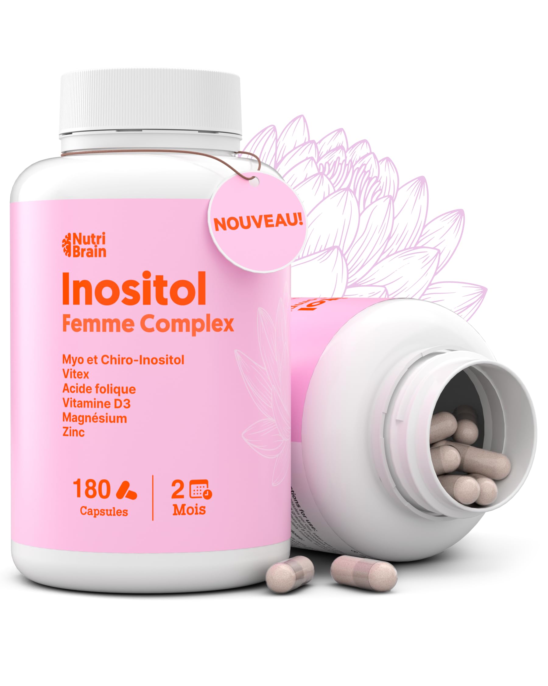 XXL JAR (180 CAPSULES) OF HIGH POTENCY AND PHARMACEUTICAL QUALITY: Made in Spain with pharmaceutical-grade ingredients, NutriBrain's Inositol Complex offers prolonged use thanks to its large number of capsules per jar. Produced according to all European quality standards, it is 100 pure and without additives, guaranteeing the highest efficacy, concentration, traceability and product safety. UP TO 60 DAYS OF USE: Flexible dosage adapted to personal goals. The high concentration of its nutrients makes it easy to integrate into your routine, adjusting the amount according to your specific needs. COMPLETE FORMULA WITH 7 NUTRIENTS: A synergistic combination of 7 ingredients carefully selected to meet the needs of women at different stages of their lives. Contains Myo and Chiro Inositol in a 40:1 ratio, concentrated Vitex extract (12:1), folic acid, vitamin D3, magnesium and zinc. WITH VITEX (CHATTERBERRY): Formulated with ultra-concentrated Vitex (12:1), a widely studied but rare ingredient in supplement formulas. Associated with supporting regular cycles and reducing premenstrual discomfort, it contributes to overall long-term feminine balance. ? 40:1 RATIO FOR PCOS (PCOS): Combines Myo D-Chiro Inositol in a 40:1 ratio. This widely studied ratio is considered ideal for supporting the health of women with PCOS (PCOS), helping to improve the body's response.POT XXL (180 CAPSULES) DE HAUTE PUISSANCE ET QUALITÉ PHARMACEUTIQUE : Fabriqué en Espagne avec des ingrédients de qualité pharmaceutique, l'Inositol Complex de NutriBrain offre une utilisation prolongée grâce à son grand nombre de capsules par pot. Produit selon toutes les normes européennes de qualité, il est 100 pur et sans additifs, garantissant la plus grande efficacité, concentration, traçabilité et sécurité du produit. JUSQU'À 60 JOURS D'UTILISATION : Dosage flexible adapté aux objectifs personnels. La haute concentration de ses nutriments facilite son intégration dans votre routine, en ajustant la quantité en fonction de vos besoins spécifiques. inconforts prémenstruels, il contribue à l'équilibre féminin global à long terme. FORMULE COMPLÈTE AVEC 7 NUTRIMENTS : Une combinaison synergique de 7 ingrédients soigneusement sélectionnés pour répondre aux besoins des femmes à différentes étapes de leur vie. Contient du myo et du chiro inositol en ratio 40:1, extrait concentré de Vitex (12:1), acide folique, vitamine D3, magnésium et zinc. AVEC VITEX (GATILIER) : Formule avec Vitex ultra-concentré (12:1), un ingrédient largement étudié mais rare dans les formules de compléments alimentaires. Associé au soutien de cycles réguliers et à la réduction des inconforts prémenstruels, il contribue à l'équilibre féminin global à long terme. ? RATIO 40:1 POUR LE SOPK (PCOS) : Combine Myo D-Chiro Inositol dans un rapport de 40:1. Ce ratio, largement étudié, est considéré comme idéal pour soutenir la santé des femmes atteintes de SOPK (PCOS), en aidant à améliorer la réponse de l'organisme.