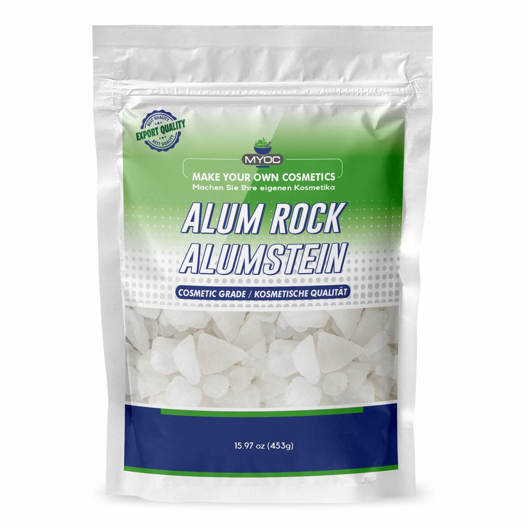 At MYOC, we offer a wide range of cosmetic raw materials for DIY cosmetic and skincare formulations. Whether you're a skincare enthusiast, formulator, or beauty brand, our high-quality ingredients make it easy to create custom skin, hair, and body care products. MYOC provides versatile, user-friendly, and blendable materials for making lotions, serums, shampoos, soaps, and more—from oils and emollients to surfactants and active ingredients. SAFETY WARNING For external use only. Avoid contact with eyes. Keep away from open flames and direct heat sources.Clean Beauty Friendly – No additives, fragrances, or preservatives. Just pure, cosmetic-grade alum rock – as natural as it gets. Recommended Use – Use up to 5 in rinse-off formulations and up to 1 in leave-on products. Patch testing recommended. Easy to Use – Grind to a powder or use in crystal form. Dissolves easily in water-based recipes or can be rubbed in directly from block form. Versatile Ingredient – Ideal for homemade deodorant sticks, aftershave blocks, toners, foot soaks, and more. Nature's Mineral Cleanser – Naturally occurring potassium alum crystals, known for their astringent, cleansing, and refreshing properties.MYOC Alaunstein Natürliche Kaliumalaunkristalle in Kosmetikqualität für DIY-Hautpflege, Deodorants, Aftershave und mehr – 453 gDESCRIPTION DU PRODUIT DESCRIPTION DU PRODUIT Bei MYOC bieten wir Ihnen eine breite Palette an kosmetischen Rohstoffen für DIY-Kosmetik- und Hautpflegeformulierungen. Ob Hautpflege-Enthusiast, Formulierer oder Beauty-Marke – mit unseren hochwertigen Inhaltsstoffen können Sie mühelos individuelle Haut-, Haar- und Körperpflegeprodukte herstellen. MYOC bietet vielseitige, benutzerfreundliche und mischbare Materialien für die Herstellung von Lotionen, Seren, Shampoos, Seifen und mehr – von Ölen und Weichmachern bis hin zu Tensiden und Wirkstoffen. AVERTISSEMENT DE SÉCURITÉ For external use only. Avoid contact with eyes. Keep away from open flames and direct heat sources.Clean Beauty Friendly – Keine Zusatz-, Duft- oder Konservierungsstoffe. Nur reines Alaungestein in Kosmetikqualität – so naturnah wie nur möglich. Empfohlene Anwendung – Bis zu 5 in abspülbaren Formulierungen und bis zu 1 in Leave-on-Produkten verwenden. Patch-Test empfohlen. Einfach zu verwenden – Zu Pulver mahlen oder in Kristallform verwenden. Löst sich leicht in wasserbasierten Rezepten auf oder kann in Blockform direkt eingerieben werden. Vielseitig verwendbare Zutat – Ideal für selbstgemachte Deosticks, Aftershave-Blöcke, Gesichtswasser, Fußbäder und mehr. Mineralreiniger der Natur – Natürlich vorkommende Kaliumalaunkristalle, bekannt für ihre adstringierenden, reinigenden und erfrischenden Eigenschaften.