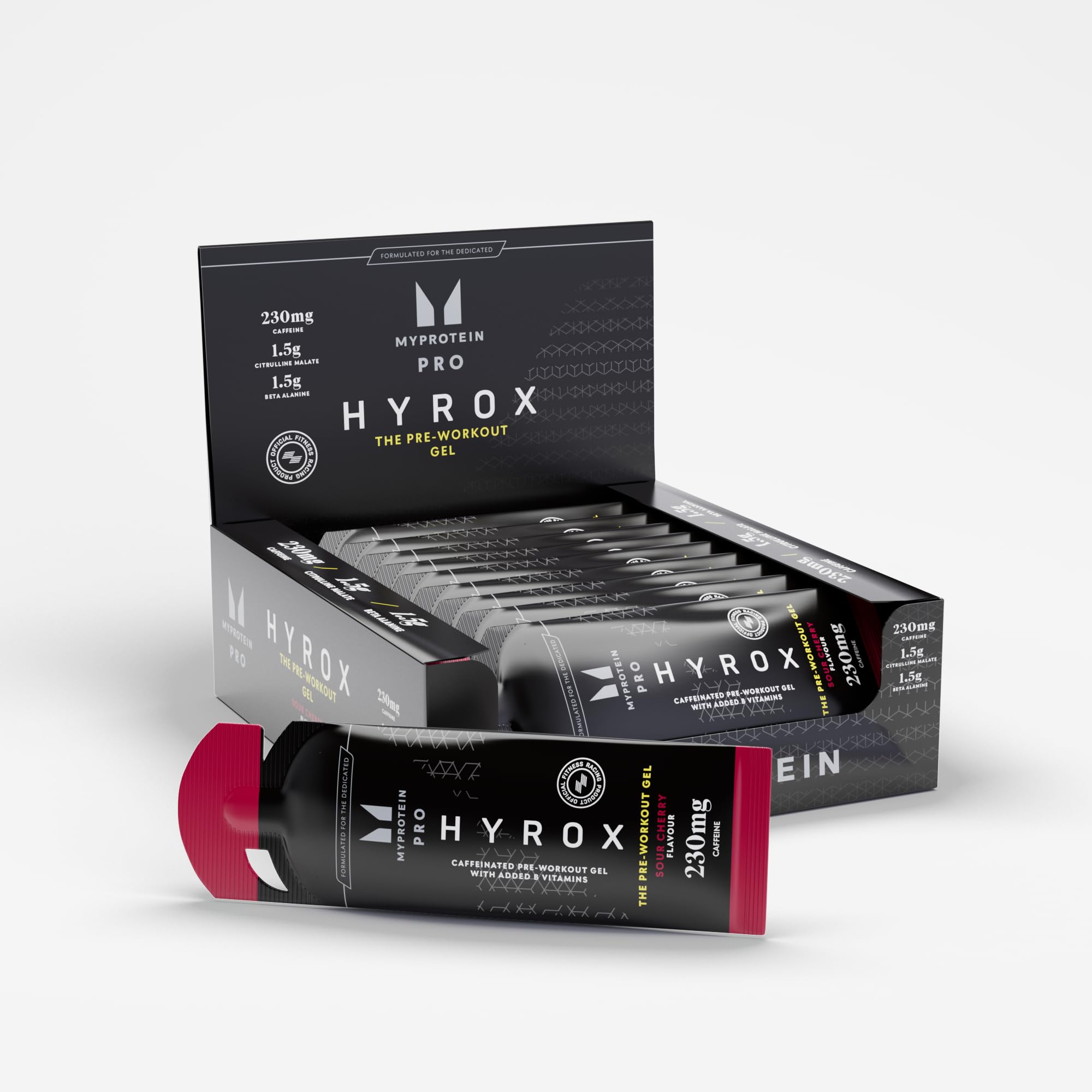 Elevate Your Training with Myprotein x HYROX Pre-Workout Gel Unlock your full potential with the Myprotein x HYROX Pre-Workout Gel, specially designed for athletes and fitness enthusiasts who demand peak performance. Whether you're preparing for a HYROX event, an endurance race, or an intense training session, this fast-acting formula delivers the fuel you need to power through. Each serving provides 230mg of caffeine, including 150mg from natural guarana extract, to sharpen focus, enhance alertness, and sustain endurance during high-intensity workouts. This powerful energy boost helps you stay locked in, push harder, and keep moving when it matters most. Formulated with 1.5g of citrulline malate, 1.5g of beta-alanine, and 1g of taurine, this gel supports muscle endurance and delays fatigue, allowing you to go the extra mile. Additionally, a precise blend of essential B vitamins, aids in energy metabolism, reduces tiredness and helps keep your body performing efficiently throughout your workout. Designed for convenience, Myprotein x HYROX Pre-Workout Gel requires no mixing or preparation - simply tear open a sachet and consume 15-30 minutes before exercise for optimal results. Whether you're training at the gym, running long distances, or tackling a HYROX competition, this gel is your go-to performance booster.MYPROTEIN x HYROX- FUEL FOR FITNESS: HYROX's ultimate fitness race meets Myprotein's expert nutrition to power peak performance. Built for strength, endurance recovery, we strive to empower athletes to push limits with more reps, sprints and lifts. VEGAN FRIENDLY PERFORMANCE-DRIVEN: Formulated for serious athletes, this vegan gel supports diverse dietary needs. Whether you're training for HYROX or crushing personal goals, take one sachet 15–30 minutes before a workout to fuel your body. ZERO PREP, MAXIMUM CONVENIENCE: Ditch the hassle of mixing powders. Just grab, tear, and go! This gel fits easily in your pocket or gym bag, making it a great pre-workout fuel for runners, cyclists, and athletes who need instant energy on the go. COMBAT FATIGUE STAY ENERGIZED: Packed with niacin and essential B vitamins (B6, B2, B1, B12), our endurance gels help fight tiredness and keep you fresh. No crashes, just sustained energy to power you through every rep, sprint, and challenge. LASTING ENDURANCE FROM START TO FINISH: Loaded with 1.5g citrulline malate, 1.5g beta-alanine 1g taurine, this gel supports muscle endurance. Feel stronger, maintain peak performance and go the extra mile. Suitable for marathon runners and athletes. INSTANT ENERGY BOOST LASER FOCUS: Myprotein x HYROX Pre-Workout Gel delivers 230mg of caffeine, including 150mg from natural guarana, to enhance focus and stamina. Push harder, run farther, and train smarter - whether in the gym or at a HYROX event.
