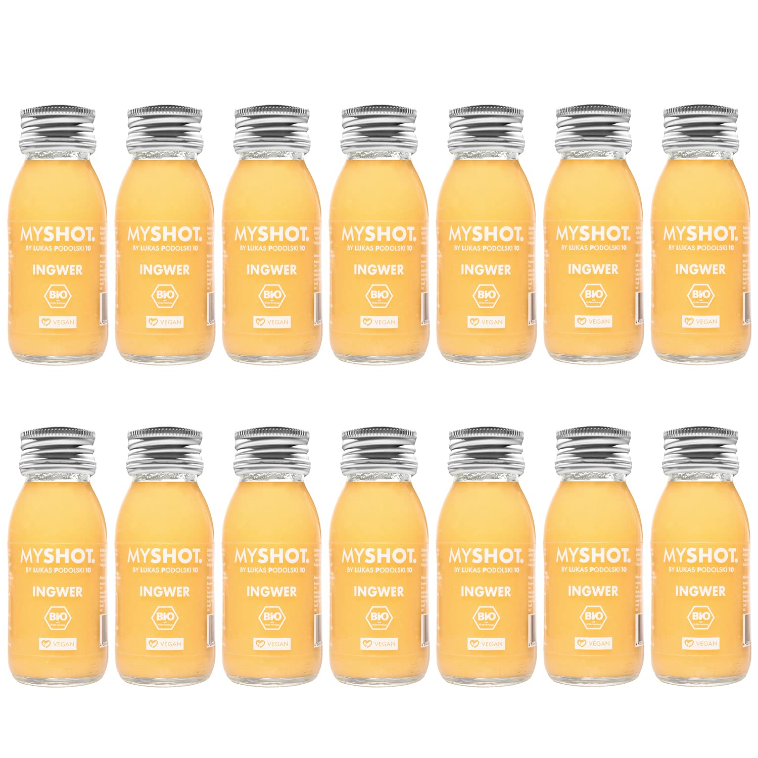MYSHOT. By Lukas Podolski 10 Ginger Shot - for a deliciously refreshing moment. Organic and vegan. Sugar-free. Additive-free. 14 x 60 ml