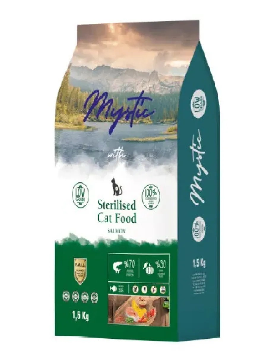 Mystic, Сухой корм для стерилизованных кошек с лососем, 1.5 кг. Корм Mystic Gourmet Adult Cat — это приготовленная еда для взрослых гурманов, которую они едят с удовольствием, независимо от породы. Он производится из свежего мяса в сыром виде по уникальной технологии (FMIS). Это альтернативное питание, приготовленное с высочайшим качеством из свежего лосося, вяленого лосося, сушеных овощей и фруктов, а также пищевых добавок из свежих продуктов. Корм содержит все необходимые питательные вещества и добавки для здоровья и активной жизни питомцев.