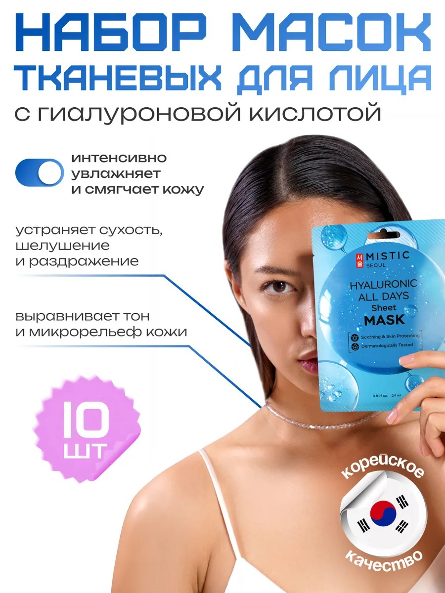 MISTIC Тканевые маски для лица с гиалуроновой кислотой 10 шт. Корея