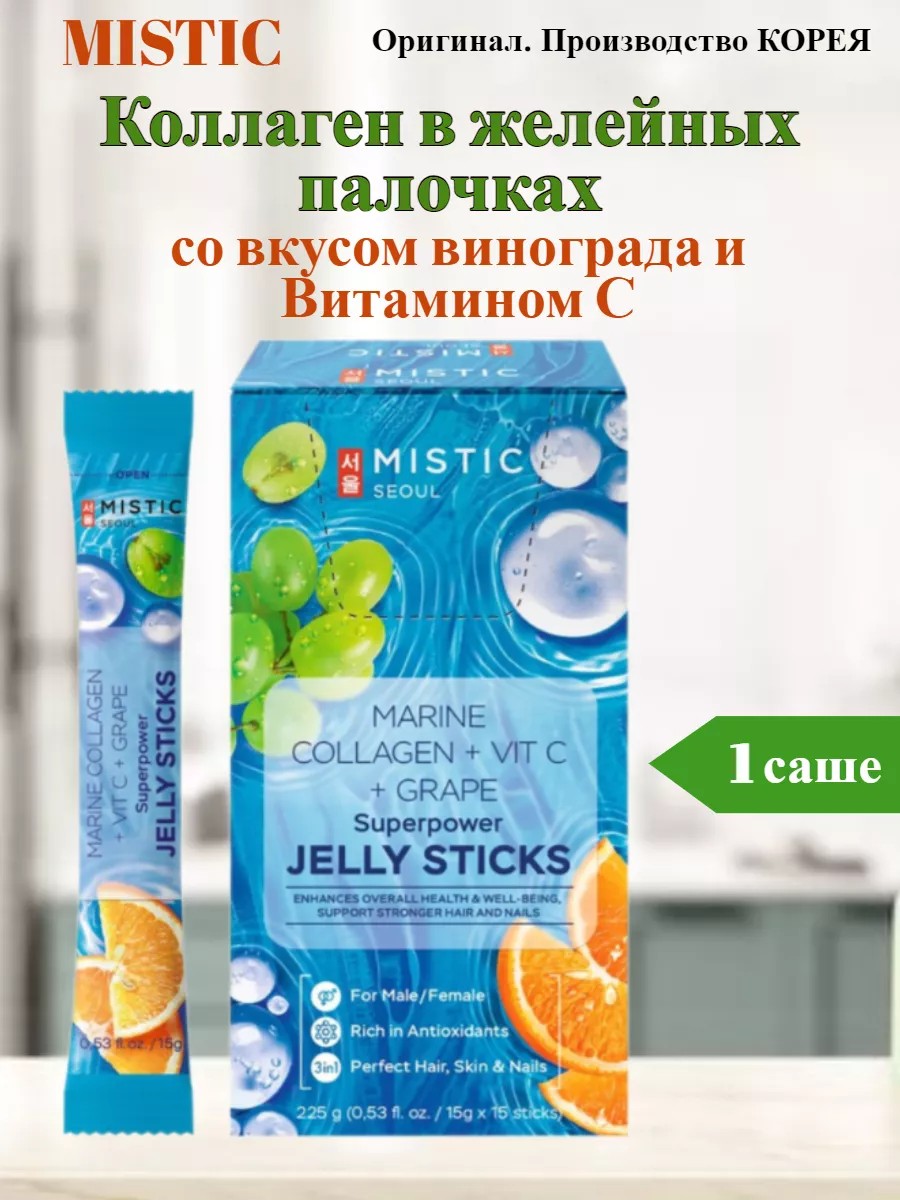 Желейные палочки с легкоусвояемым морским коллагеном помогают сохранить упругость кожи, способствуют укреплению волос, ногтей и суставов, а витамин C поддерживает общий иммунитет. Натуральный концентрат из зеленого винограда обогащает организм витаминами и обеспечивает необходимый набор антиоксидантов. Продукт содержит натуральный пребиотик, является источником пищевых волокон и имеет низкокалорийный состав и приятный виноградный вкус. Палочки в удобном формате для поддержания благополучия и красоты! Способ применения:суточная норма - 1 пакетик. Употребить весь продукт целиком необходимо сразу после вскрытия, тщательно пережевывая. Меры предосторожности: Индивидуальная непереносимость компонентов. Продукт может содержать следы аллергенов (персика, сои, молока, пшеницы, арахиса и яиц). Перед использованием проконсультируйтесь с врачом при беременности или кормлении грудью. Не подходит для детей до 1 года. Условия хранения: хранить в сухом и прохладном месте вдали от прямых солнечных лучей. Хранить в недоступном для детей месте.