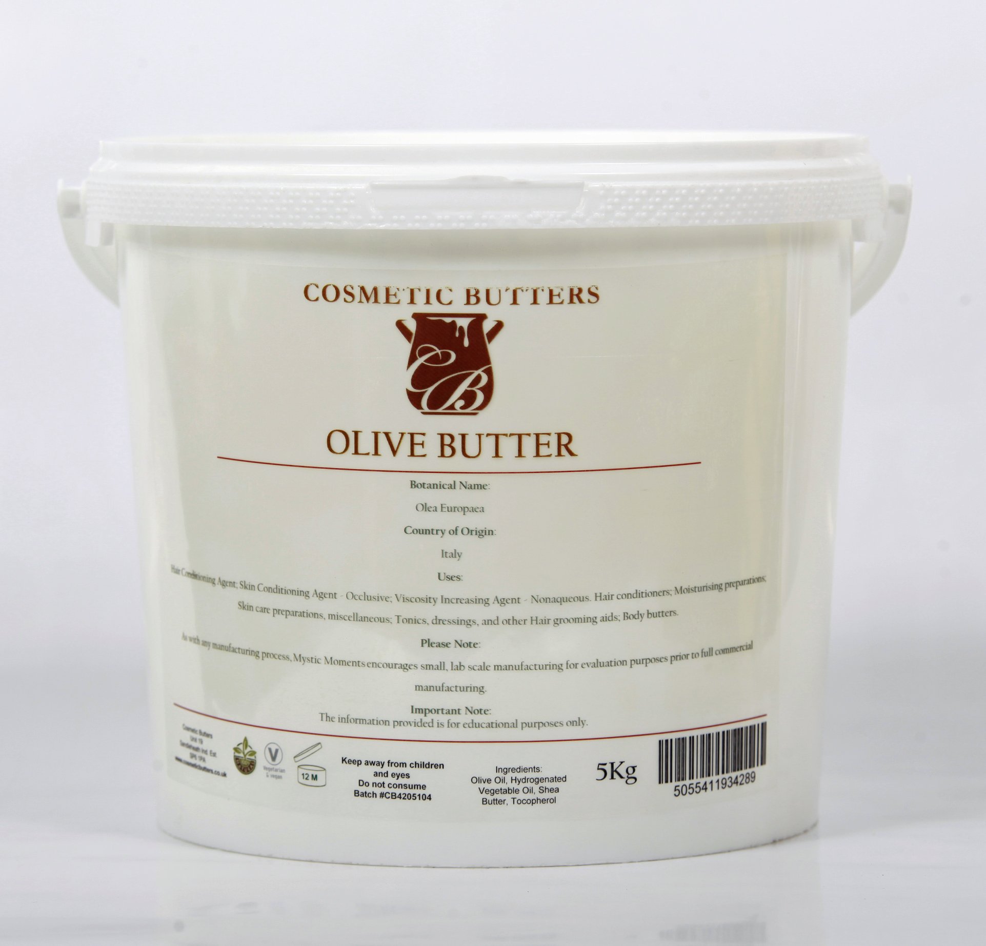 Olive Blended Butter - 5Kg   INCI: Olea Europaea Fruit Oil, Hydrogenated Vegetable Oil, Butyrospermum Parkii Butter, Tocopherol   Description: Olive Blended Butter is an excellent emollient and has good antioxidant properties. If sensitivity to Shea Butter develops, this butter is the perfect substitute as it exhibits many of the same characteristics. Olive oil is very high in vitamins and a wide variety of nourishing fatty acids which aid with the re-hydration of dry or, more specifically, mature skin and hair. Especially helpful to nails and cuticles.   Uses: Typically used in nail treatments, soaps, creams, lotions, lip balms, body butters, hair pomades, bath bombs and hair conditioners.   Skin Type: Dry, mature skin and hair.   Country of Origin: Italy, Spain   Product Type: Blended Butter   Recommended Usage: It is oil soluble (not water soluble) and is usually incorporated via the oil phase when preparing emulsions. It has no known incompatibilities.   Storage: It should be stored in a cool dark place and has a shelf-life of up to 12 months from opening when stored properly.   Important Note: For external use only. Keep away from children and eyes. The information provided is for educational purposes only. The appearance of this butter may slightly vary from batch to batch due to natural ingredients present in this product.   Please Note: As with any manufacturing process, Mystic Moments encourages small, lab scale manufacturing for evaluation purposes prior to full commercial manufacturing.ABOUT US: Mystic Moments is part of Madar Corporation Ltd, a family-owned business based on the edge of the New Forest. We pride ourselves on offering our customers a high standard of quality, competitive prices, fast delivery and great customer service. COMMON USES: Typically used in nail treatments, soaps, creams, lotions, lip balms, body butters, hair pomades, bath bombs and hair conditioners. SKIN TYPE: Dry, mature skin and hair. INCI: Olea Europaea Fruit Oil & Hydrogenated Vegetable Oil & Tocopherol. Olive Blended Butter is an excellent emollient and has good antioxidant properties and is the perfect substitute to Shea Butter, as it exhibits many of the same characteristics. Suitable for all skin and hair types but particularly dry, mature skin.