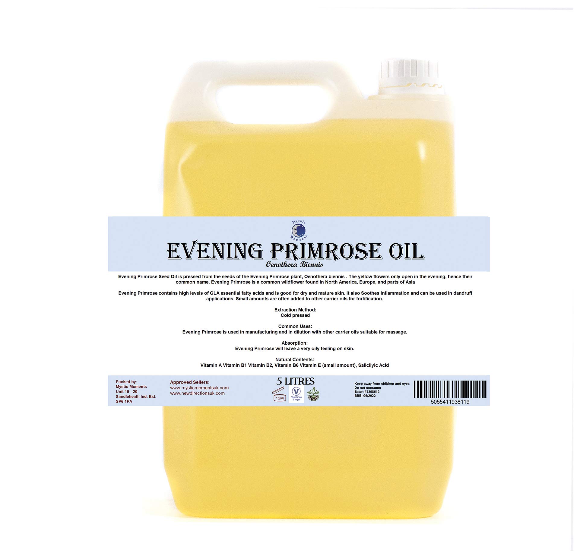 Evening Primrose beam oil - 5 liters Botanical name: Oenothera Biennis Extraction method: solid oil, which by extraction from the seeds Processing type is preserved: RBD Received from: seeds Land of origin: China Description: Evening primrose contains a high degree of GLA essential acids and is good for dry and maturity.Skin.The oil penetrates the skin and makes the skin softer.It has moisture authorities that dry the skin increases the ability of the cells to absorb oxygen.Other amounts are often added to other carrier oils for fastening.Mobile liquid Absorption: quickly included in the skin Shelf life: evening primrose oil is rancid quickly Users can expect a shelf life of up to 6 months with suitable storage conditions (cool, from direct sunlight).Adding vitamin E at 0.5 increases to 24 months.The cooling after opening is recommended. do not consume.For external use only.Keep away from children and eyes.documents: Safety data sheet, IFRA document, Allergen -Document and CLP lettering are available on request.at US: Mystic Moments is part of Madar Corporation LTD, a family company based on the edge of the New Forest.We are proud to offer our customers a high quality standard, competitive prices, fast delivery and great customer service.Oil variety: Our collection of carrier oils is available in a variety of sizes to meet your requirements.Regardless of whether you buy a friend or a loved one for yourself, you will find the right product.Frequent uses: a popular component in many products for sensitive skin, in anti-wrinkle skin rejuvenation oils and scenes.botanical name: Oenothera Biennis.Abend Primrose -Trägeröl - 5 Liter Botanischer Name: Oenothera Biennis Extraktionsmethode: Festes Öl, das durch Extraktion aus den Samen Verarbeitungsart erhalten wird: Rbd erhalten aus: Samen Herkunftsland: China Beschreibung: Abendprimrose enthält ein hohes Maß an GLA -Essentialsäuren und ist gut für Trocken und Reife. Haut. Das Öl dringt in die Haut ein und macht die Haut weicher. Es hat Feuchtigkeitsbehörden, die die Haut trocknen, erhöht die Fähigkeit der Zellen, Sauerstoff zu absorbieren. Andere Beträge werden häufig zu anderen Trägerölen zur Befestigung hinzugefügt. Mobile Flüssigkeit Absorption: schnell in die Haut aufgenommen Haltbarkeit: Abendprimroseöl ist schnell ranzig Benutzer können eine Haltbarkeit von bis zu 6 Monaten mit geeigneten Speicherbedingungen erwarten (cool, aus direktem Sonnenlicht). Das Hinzufügen von Vitamin E bei 0,5 erhöht sich auf 24 Monate. Die Kühlung nach dem Öffnen wird empfohlen. nicht konsumieren. Nur für äußere Anwendung. Von Kindern und Augen fernhalten.Dokumente: Sicherheitsdatenblatt, IFRA -Dokument, Allergen -Dokument und CLP -Beschriftungen sind auf Anfrage verfügbar. At Us: Mystic Momente ist Teil von Madar Corporation Ltd, einem Familienunternehmen, das am Rande des New Forest basiert. Wir sind stolz darauf, unseren Kunden einen hohen Qualitätsstandard, Wettbewerbspreise, schnelle Lieferung und einen großartigen Kundenservice zu bieten. oil -Sorte: Unsere Sammlung von Trägerölen ist in einer Vielzahl von Größen erhältlich, um Ihren Anforderungen zu entsprechen. Egal, ob Sie für sich selbst, einen Freund oder einen geliebten Menschen kaufen, Sie finden das richtige Produkt. Häufige Verwendungszwecke: Ein beliebter Bestandteil in vielen Produkten für empfindliche Haut, in Anti-Falten- Hautverjüngungsölen und -sseren. botanischer Name: Oenothera Biennis.Mystic Moments Abends Primrose -Trägeröl 5 Liter - reines und natürliches Öl perfekt für Haare, Gesicht, Nägel, Aromatherapie, Massage und Ölverdünnung Veganer GVO -frei