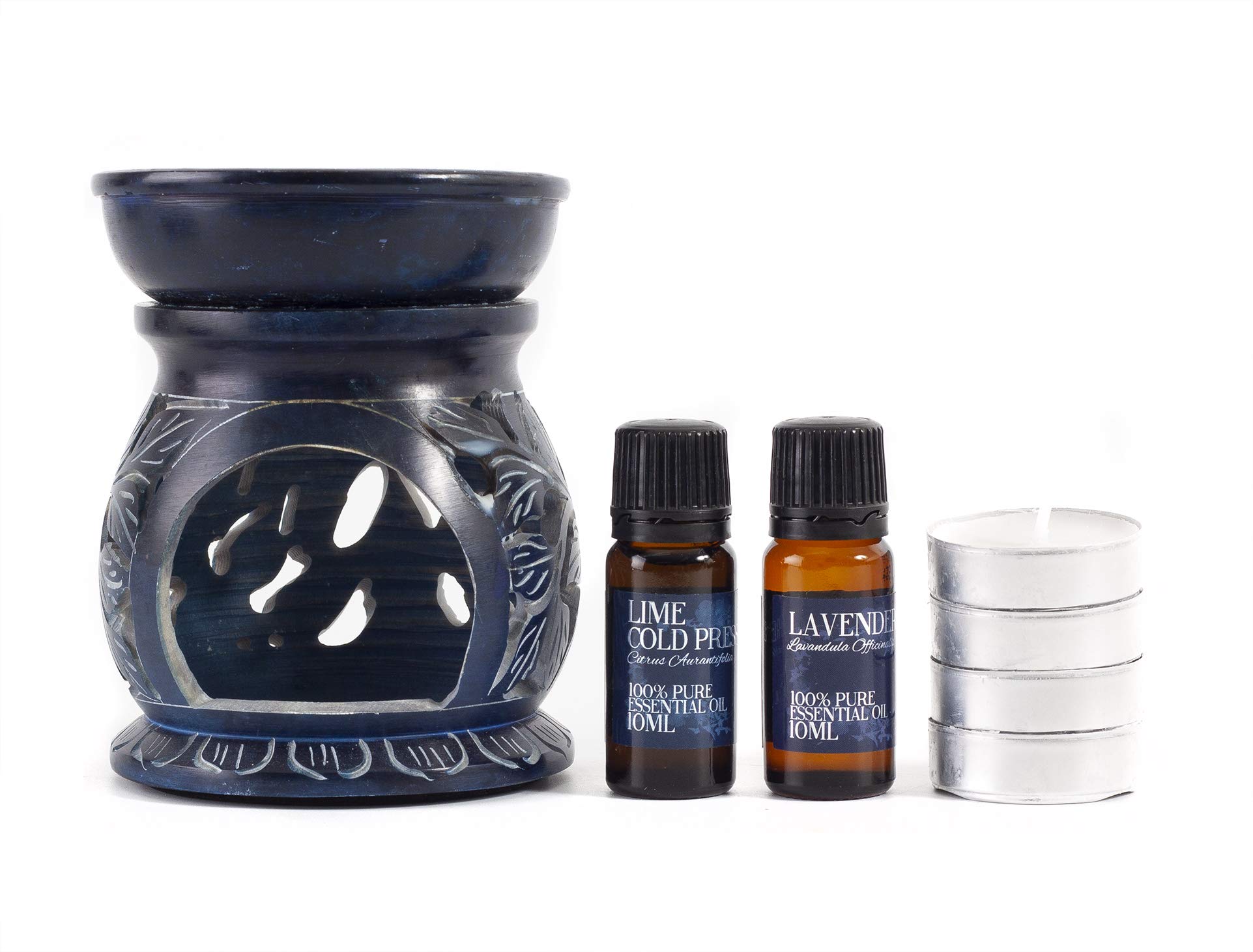 4 x White Unscented Tea Lights. 1 x Lime Cold Pressed Essential Oil (10ml). 1 x Lavender Essential Oil (10ml). 1 x Blue Soapstone Oil Burner. Lavender and Lime Oil Burner Gift Set.