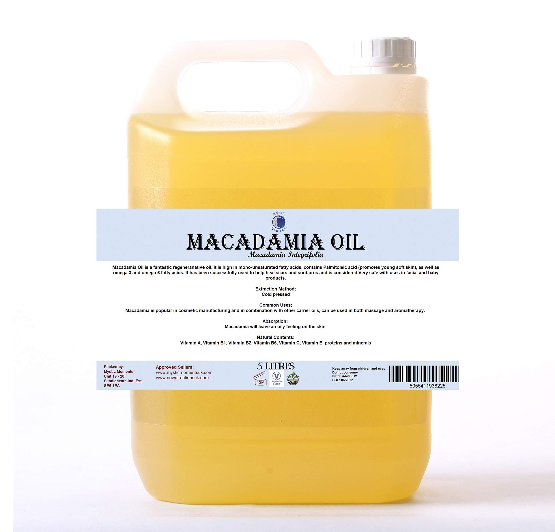 Macadamia oil - 5 liters - 100 pure Botanical name: Macadamia Integrifolia Extraction method: cold pressed Description: Macadamia oil is fantastic regeneration oil.It is high in mono unsaturated fatty acids, contains palmitolenic acid (promotes young soft skin) as well as omega 3 and omega 6 fatty acids.Viewed very safely with use in facial and baby products.It is ideal for ripening and dry skin, since this slowly absorbed oil maintains the skin moisture. Color: clear, light yellow liquid Aromatic description: Macadamia has very little fragrance that for most carrier oils is often used: excellent for body massage and also is products that protect the skin from weather and wind like hand creams.It is often used in anti-fold products such as oil mixtures, creams, ointments, balms and lotions.These oils are not recommended for oily, acne or with large posed skin because it can cover pores. Consistency: mobile liquid, slower, thicker than typical carrier oils Absorption: very slowly absorbed into the skin. Shelf life: Users can expect a durability of 18 months with adequate storage conditions (cool, from direct sunlight).Cooling after opening is recommended. Prevention measures: should be avoided by people with nut allergies.Do not consume.For external use only.Keep away from children and eyes.documents: Safety data sheet, IFRA document, Allergen -Document and CLP lettering are available on request.at US: Mystic Moments is part of Madar Corporation LTD, a family company based on the edge of the New Forest.We are proud to offer our customers a high quality standard, competitive prices, fast delivery and great customer service.Oil variety: Our collection of carrier oils is available in a variety of sizes to meet your requirements.Regardless of whether you buy a friend or a loved one for yourself, you will find the right product.Frequent uses: Excellent for body massage and also products that protect the skin from weather and wind like hand creams.It is often used in anti-fold products such as oil mixtures, creams, ointments, balms and lotions.These oils are not recommended for oily, acne or with large posed skin because it can cover pores.botanical name: Macadamia Integriifeia.Macadamiaöl - 5 Liter - 100 reines Botanischer Name: Macadamia integrifolia Extraktionsmethode: Kaltgedrückt Beschreibung: Macadamiaöl ist fantastisch Regenerationsöl. Es ist hoch in mono ungesättigten Fettsäuren, enthält Palmitolensäure (fördert junge weiche Haut) sowie Omega 3 und Omega 6-Fettsäuren. Mit Verwendung in Gesichts- und Babyprodukten sehr sicher angesehen. Es ist ideal für reife und trockene Haut, da dieses langsam absorbierte Öl die Hautfeuchtigkeit beibehält. Farbe: Klar, hellgelbe Flüssigkeit Aromatische Beschreibung: Macadamia hat sehr wenig Duft, das für die meisten Trägeröle häufig verwendet wird: Ausgezeichnet für die Körpermassage und auch auch ist Produkte, die die Haut vor Wetter und Wind wie Handcremes schützen. Es wird häufig in Anti-Falten-Produkten wie Ölmischungen, Cremes, Salben, Balsamen und Lotionen verwendet. Diese Öle werden nicht für ölige, akne oder mit großer posierte Haut empfohlen, da sie Poren abdecken kann. Konsistenz: Mobile Flüssigkeit, langsamer, dicker als typische Trägeröle Absorption: sehr langsam in die Haut absorbiert. Haltbarkeit: Benutzer können eine Haltbarkeit von 18 Monaten mit angemessenen Speicherbedingungen erwarten (cool, aus direktem Sonnenlicht). Kühlung nach dem Öffnen wird empfohlen. Vorsichtsmaßnahmen: Sollte von Personen mit Nussallergien vermieden werden. Nicht konsumieren. Nur für äußere Anwendung. Von Kindern und Augen fernhalten.Dokumente: Sicherheitsdatenblatt, IFRA -Dokument, Allergen -Dokument und CLP -Beschriftungen sind auf Anfrage verfügbar. At Us: Mystic Momente ist Teil von Madar Corporation Ltd, einem Familienunternehmen, das am Rande des New Forest basiert. Wir sind stolz darauf, unseren Kunden einen hohen Qualitätsstandard, Wettbewerbspreise, schnelle Lieferung und einen großartigen Kundenservice zu bieten. oil -Sorte: Unsere Sammlung von Trägerölen ist in einer Vielzahl von Größen erhältlich, um Ihren Anforderungen zu entsprechen. Egal, ob Sie für sich selbst, einen Freund oder einen geliebten Menschen kaufen, Sie finden das richtige Produkt. Häufige Verwendungszwecke: Ausgezeichnet für die Körpermassage und auch Produkte, die die Haut vor Wetter und Wind wie Handcremes schützen. Es wird häufig in Anti-Falten-Produkten wie Ölmischungen, Cremes, Salben, Balsamen und Lotionen verwendet. Diese Öle werden nicht für ölige, akne oder mit großer posierte Haut empfohlen, da sie Poren abdecken kann. Botanischer Name: Macadamia integrifolia.Mystic Moments Macadamia -Trägeröl 5 Liter - reines natürliches Öl perfekt für Haare, Gesicht, Nägel, Aromatherapie, Massage und Ölverdünnung Veganer GVO frei