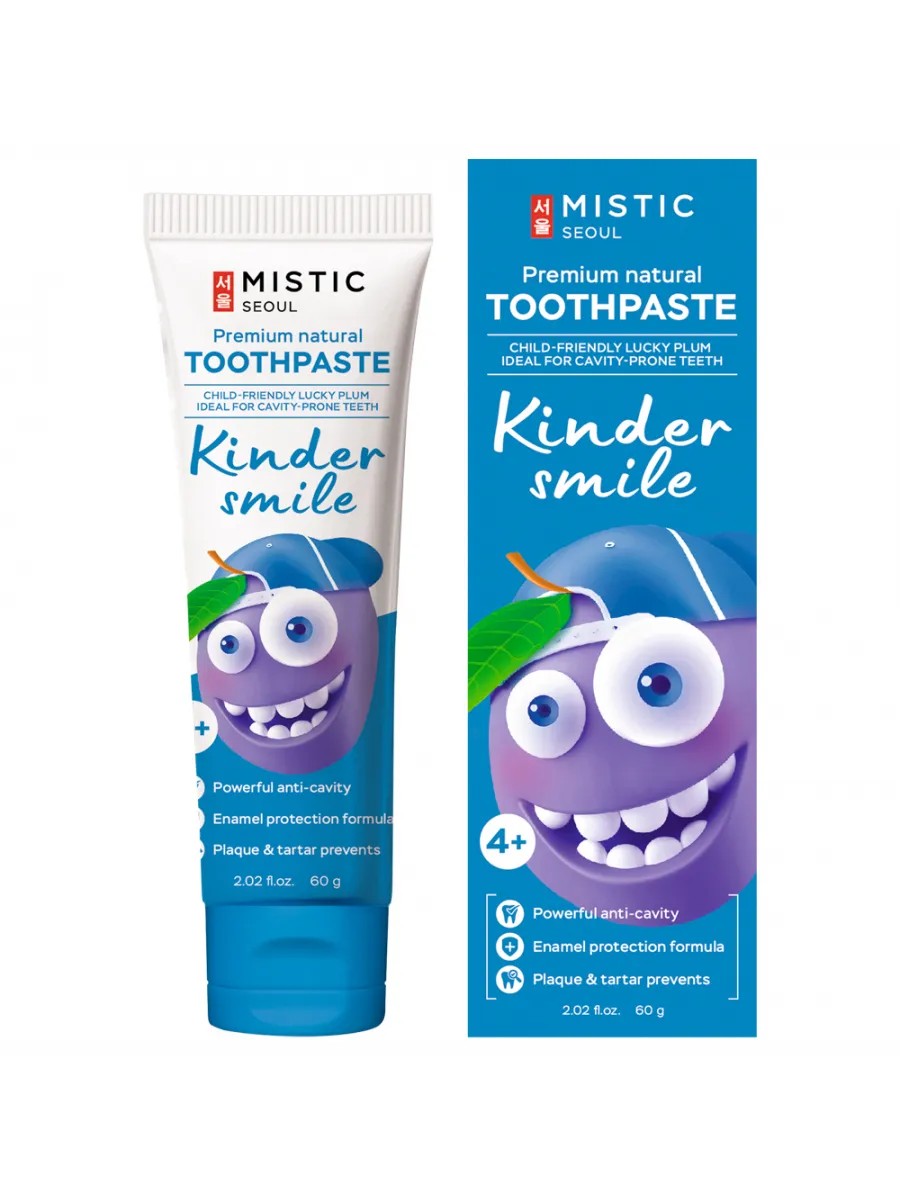 Mistic Premium Natural Toothpaste Kinder Smile Lucky Plum for Cavity-Prone Teeth Natural children's premium toothpaste Kinder Smile "Lucky Plum" for cavities-prone teeth (4+), 60g, 1 piece. Mistic children's toothpaste with plum flavor and fluoride content (1000 ppm) is specially designed for teeth prone to cavities. The natural ingredients and hydroxyapatite provide powerful protection against cavities, prevent gum inflammation and care for the oral cavity. Xylitol normalizes the oral microflora and has an antibacterial effect. The plum flavor promotes fresh breath and makes brushing teeth more pleasant. The formula is specially developed for children's use, which guarantees complete safety. Does not contain parabens, SLS, SLES. How to use: Apply a small amount of paste to the toothbrush. Brush your teeth 2-3 times a day for 2-3 minutes. Suitable for daily use. Intended for children 4 years and older. Use strictly under adult supervision.