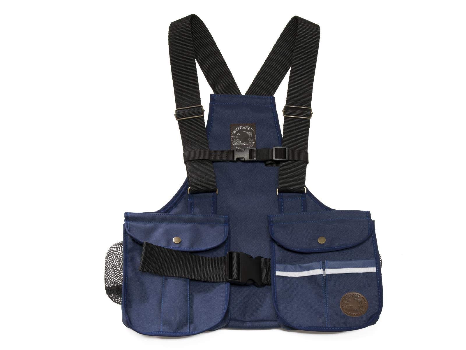Mystique Dummy West ""Trainer"" is ideal for the simple and pleasant transport of training accessories such as dummies, linen or delicacies, as well as when hunting for wild transport. After a training or hunting day, with many dummies or wildly stowed away in a pocket, your back can put a lot of strain on.So that these days become more gratifying and more pleasant, we have developed a new vest that has an adjustable belly belt that distributes the weight evenly on your hips.At the same time, it was designed so that the shoulder straps did not cut when the vest is filled.The large front bags offer enough space for all training aids such as leash, tennis ball, dummy disc and, as an extra, has a bag in the 2 pocket dummies.The dummy vest has a carabiner in the right side, where can you attach ball slingshot or drinking bottle.The vest is water and blood resistant.Your polyethane coating is easy to clean.You don't have to be afraid of stowing wet dummies. With plastic buckle. Handmade. NEW: From now on a special adjustable band like a new part on our West offers you more security and comfort. External material: PES Size: S (40-42), M (44-46), L (48-50 of a carabiner in the right side. Large front pockets. With an adjustable belly belt. For easy and pleasant transport of training accessories. Mystique Dummyweste ""Trainer"" ist ideal zum einfachen und angenehmen Transport von Trainingszubehör wie zum Beispiel Dummys, Leinen oder Leckereien, sowie bei der Jagd zum Wildtransport. Nach einem Trainings- oder Jagdtag, mit vielen Dummies oder Wild verstaut in einer Tasche, kann ihren Rücken sehr belasten. Damit diese Tage erfreulicher und angenehmer werden, haben wir eine neue Weste entwickelt, die einen verstellbaren Bauchgurt hat, der das Gewicht gleichmäßig auf Ihre Hüften verteilt. Gleichzeitig wurde sie so gestaltet, dass die Schultergurte nicht einschneiden, wenn die Weste gefüllt ist. Die großen Fronttaschen bieten genug Platz für alle Trainingshilfen wie Leine, Tennisball, Dummy Disc und hat als Extra noch eine Tasche in die 2 Pocket Dummies passen. Die Dummyweste hat ein Karabiner in der rechten Seite, wo kann man Ballschleuder oder Trinkflasche anhängen. Die Weste ist Wasser- und Blutbeständig. Ihre Polyrethane- Beschichtung ist einfach zu reinigen. Man braucht keine Befürchtungen zu haben, nasse Dummies zu verstauen. Mit Kunststoffschnalle. Handgefertigt. NEU: Ab jetzt ein spezielles verstellbares Band wie ein neuer Teil auf unseren Westen bietet Ihnen mehr Sicherheit und Komfort. Außenmaterial: PES Größe: S (40-42), M (44-46), L (48-50einem Karabiner in der rechten Seite. große Fronttaschen. mit einen verstellbaren Bauchgurt. zum einfachen und angenehmen Transport von Trainingszubehör.Mystique Dummyweste Trainer Kunstoffverschluss M seemannsblau