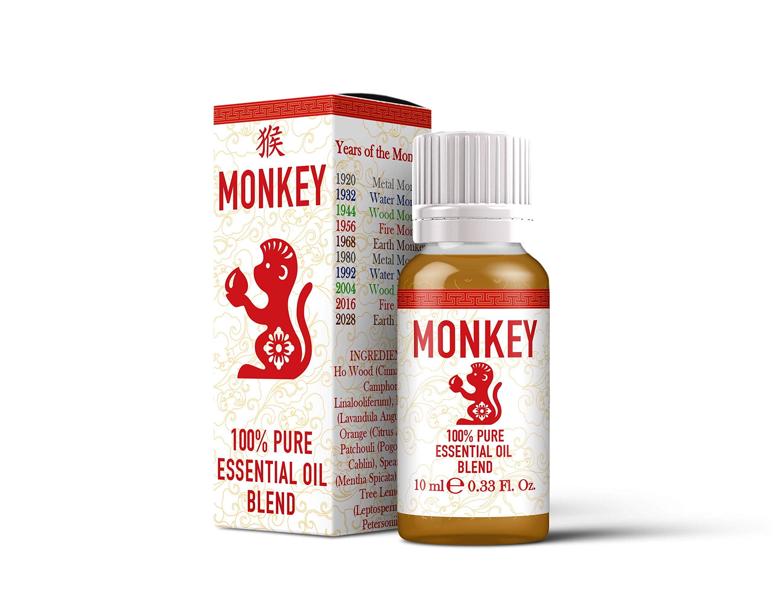 Monkey - Chinese Zodiac Essential Oil Blend Those born under the sign of the Monkey are intelligent, enthusiastic and goal-oriented but are easily discouraged and confused. They can easily influence other people, but that will sometimes produce a feeling of distrust from others, and they can be taken as opportunists. Monkeys are usually successful in any endeavor they undertake. This blend contains oil to help enhance the characteristics of the Monkey! Contains: Ho Wood (Cinnamomum Camphora Linalooliferum), Lavender (Lavandula Angustifolia), Orange (Citrus Amara), Patchouli (Pogostemon Cablin), Spearmint (Mentha Spicata) and Tea Tree Lemon (Leptospermum Petersonii). Only the 10ml bottles come in a presentation box with instruction leaflet included. The blend can be applied to the base of the feet for absorption, the nape of the neck and can also be inhaled. Always dilute before use. Never use pure oils on the skin without diluting, never use internally, keep away from children and eyes, always check if there are any medical issues which could cause a problem. Seek help if you have any doubts. Do not consume or apply undiluted to the skin