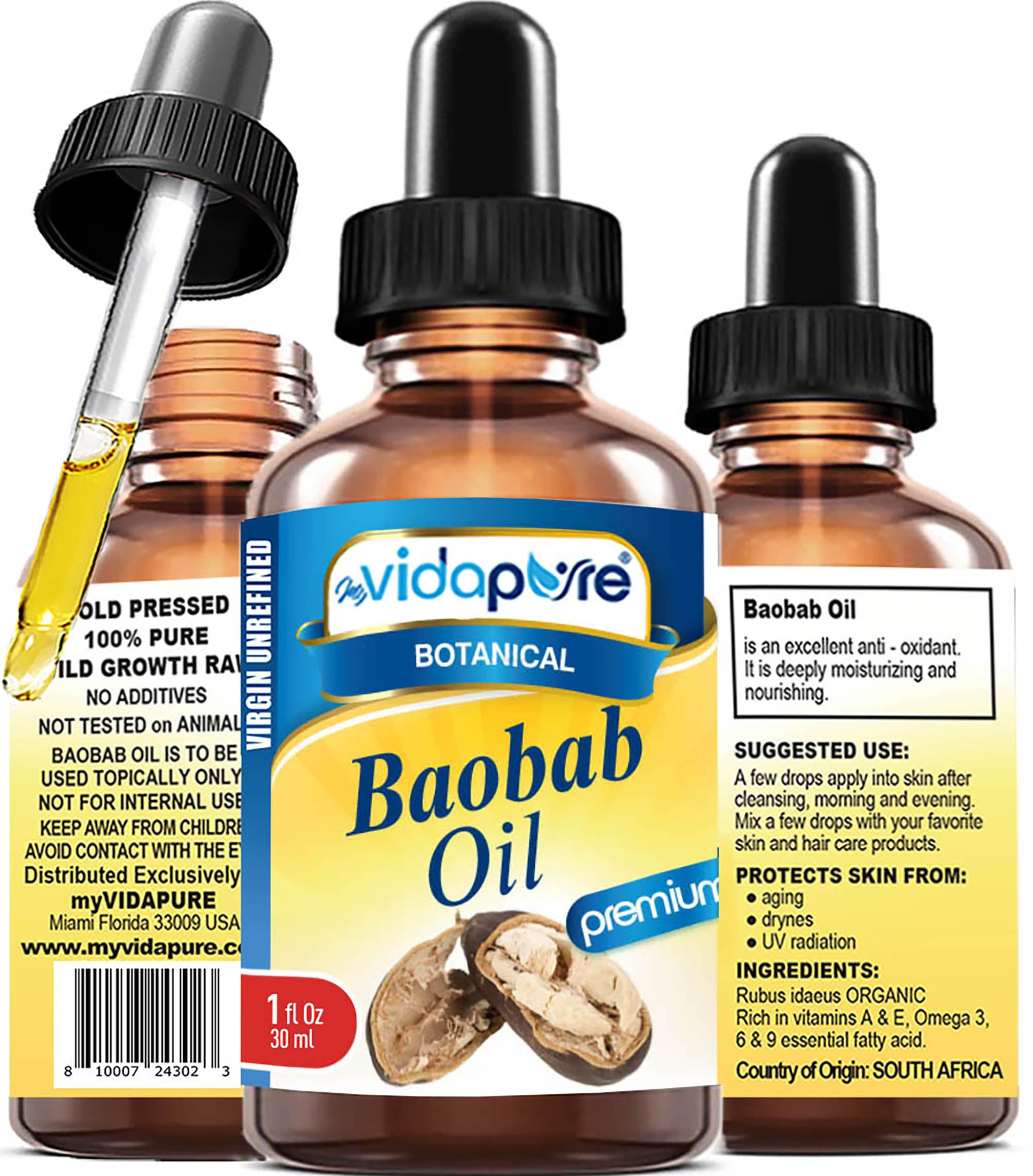 MYVIDAPURE 100% Pure BAOBAB OIL WILD GROWTH RAW for Skin, Hair, Lip and Nail Care. (1 Fl Oz) 1 Fl Oz (Pack of 1)