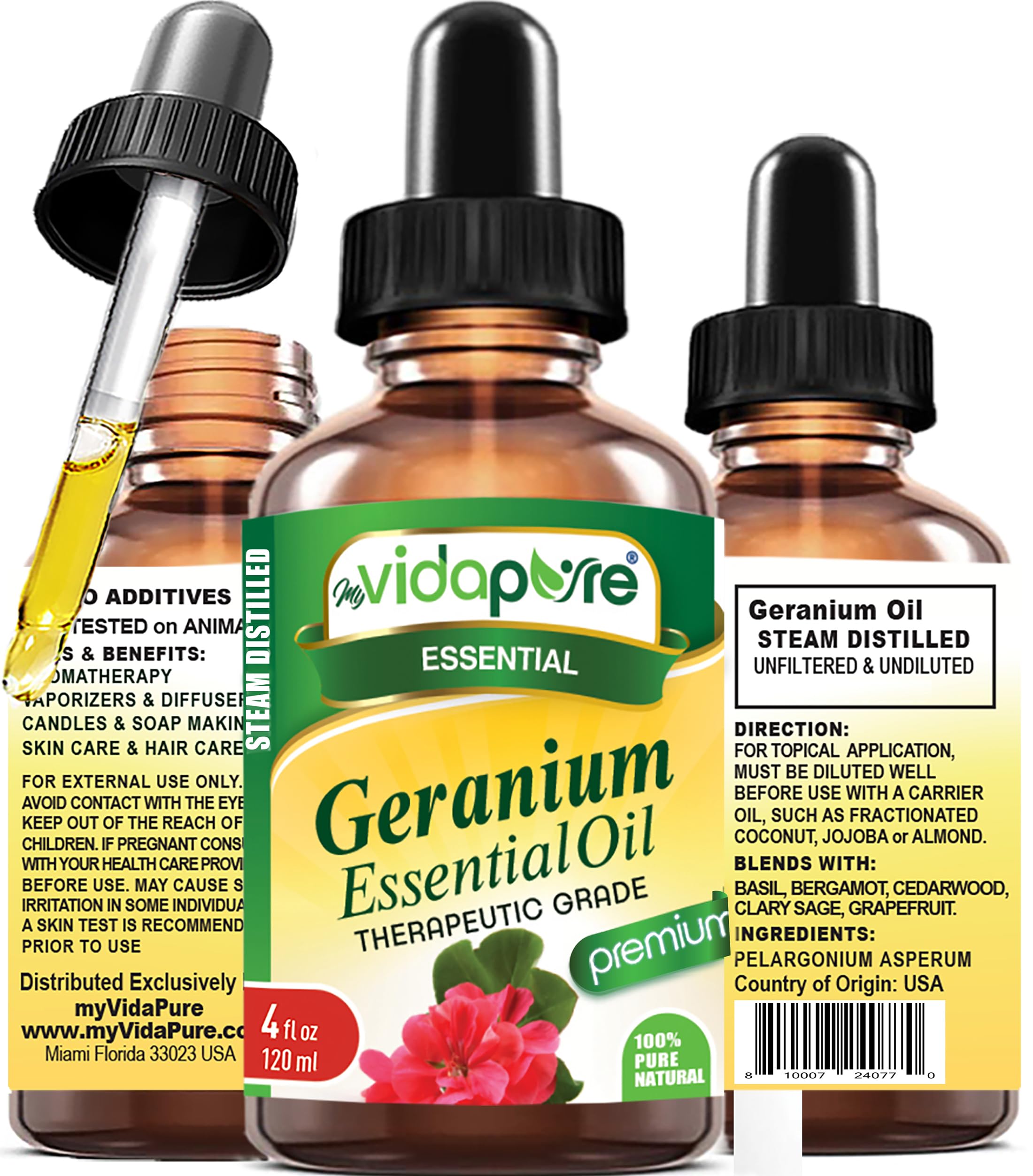 ORGANIC GERANIUM ESSENTIAL OIL BLENDS WELL WITH - Lavender, Rose, Myrrh, Bergamot, Black pepper, Patchouli, Ylang-Ylang, Frankincense, Juniper berry, Pine, Vetiver, Cypress, Eucalyptus, Melaleuca, Rosemary, Fir, Cypress, Basil, Frankincense, Sage, Thyme, Citronella, Chamomile, Cedarwood, Clary Sage, Lemongrass, Peppermint, Grapefruit, Lime, and Eucalyptus. ORGANIC GERANIUM ESSENTIAL OIL BENEFITS and USES: Beauty Care, Skin Care, Hair Care, Bath Products, Massage Oils, Lotions, Soaps, Shampoos, Soap Making, Bath Bombs, Candle Making, Candles, Aromatherapy, Aromatherapy Products, Perfume Making, and So Much More!. PERFECT FOR YOUR DIFFUSER - for All Types Diffusers ( Reed Diffusers, Ultrasonic Diffusers, Humidifiers, Steam Diffusers Burners More! ). myVidaPure ORGANIC GERANIUM ESSENTIAL OIL Pelargonium asperum has a herbaceous sweet geranium like aroma. myVidaPure ORGANIC GERANIUM ESSENTIAL OIL Pelargonium asperum is 100 PURE THERAPEUTIC GRADE ESSENTIAL OIL. STEAM DISTILLED No chemicals or synthetic solvents. No fillers, additives or carriers added, vegan, and cruelty-free.