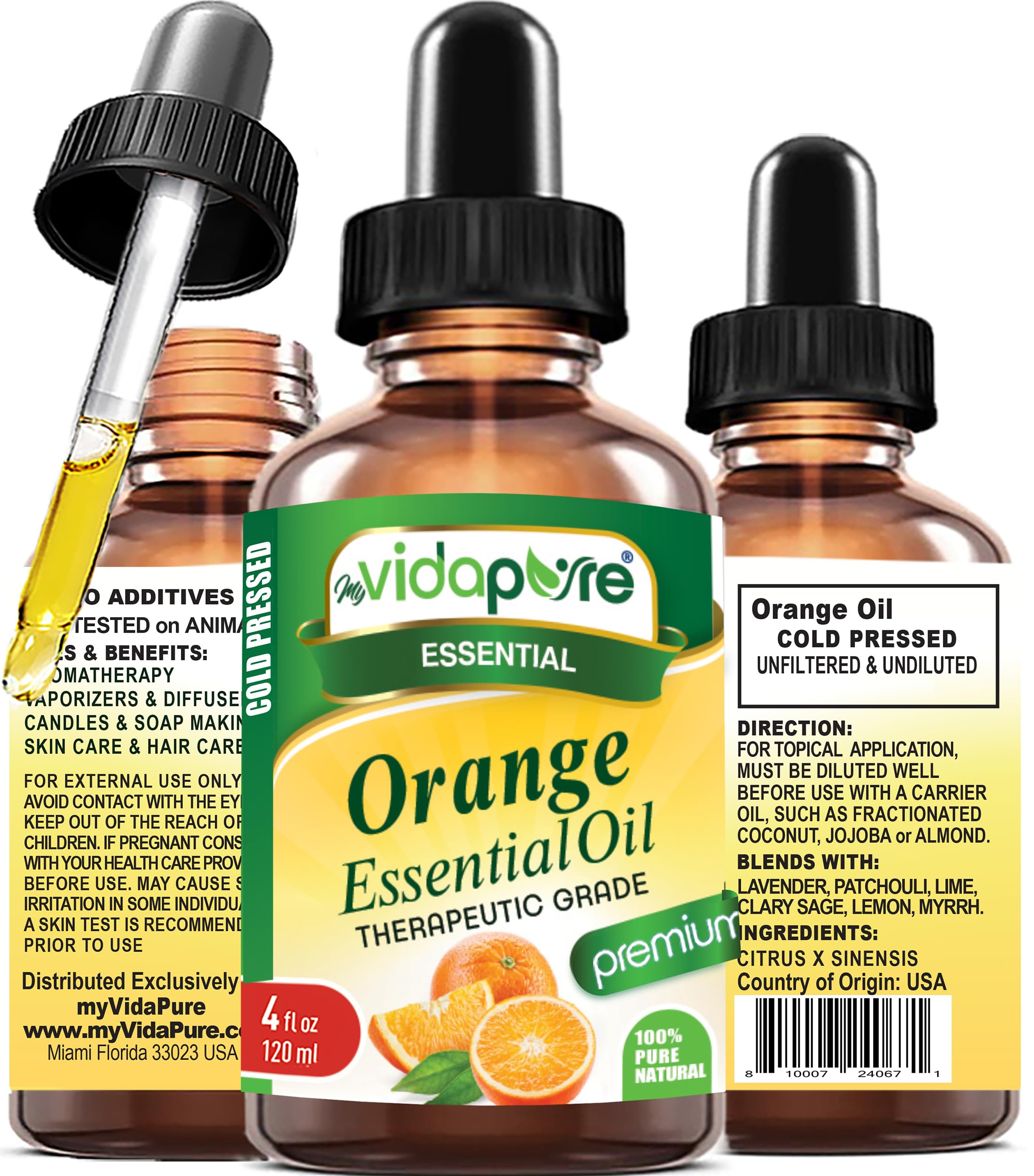 myVidaPure ORANGE ESSENTIAL OIL Citrus x sinensis is 100 PURE THERAPEUTIC GRADE ESSENTIAL OIL. COLD PRESSED. No fillers, additives or carriers added, vegan, and cruelty-free. ORANGE ESSENTIAL OIL has a rich crisp and orange aroma PERFECT FOR YOUR DIFFUSER - for All Types Diffusers ( Reed Diffusers, Ultrasonic Diffusers, Humidifiers, Steam Diffusers Burners More! ) ORANGE ESSENTIAL OIL BENEFITS and USES: Beauty Care, Skin Care, Hair Care, Bath Products, Massage Oils, Lotions, Soaps, Shampoos, Soap Making, Bath Bombs, Candle Making, Candles, Aromatherapy, Aromatherapy Products, Perfume Making, and So Much More! myVidaPure ORANGE ESSENTIAL OIL BLENDS WELL WITH - Geranium, Lavender, Rose, Myrrh, Bergamot, Black pepper, Patchouli, Ylang-Ylang, Frankincense, Juniper berry, Pine, Vetiver, Cypress, Eucalyptus, Melaleuca, Rosemary, Fir, Cypress. ORANGE ESSENTIAL OIL is a thin clear oil. Glass bottle with dropper. Directions: Topical and aromatic use only. Always dilute essential oils with a carrier oil before applying directly to the skin. Essential Oils are CLEAR. Essential Oils have a thin, water-like consistency. Although we bottle our oils in colored glass bottles to protect them from UV light damage, the oils themselves are always clear in color. This is normal, all essential oils are clear. Also, although "Essential Oil" has the word "oil" in it, which can bring to mind a thicker substance more like, for example, olive oil, Essential Oils actually have a very thin consistency and are more like the consistency of water - they do not present as 'oily'.myVidaPure ORANGE ESSENTIAL OIL BLENDS WELL WITH - Geranium, Lavender, Rose, Myrrh, Bergamot, Black pepper, Patchouli, Ylang-Ylang, Frankincense, Juniper berry, Pine, Vetiver, Cypress, Eucalyptus, Melaleuca, Rosemary, Fir, Cypress. ORANGE ESSENTIAL OIL BENEFITS and USES: Beauty Care, Skin Care, Hair Care, Bath Products, Massage Oils, Lotions, Soaps, Shampoos, Soap Making, Bath Bombs, Candle Making, Candles, Aromatherapy, Aromatherapy Products, Perfume Making, and So Much More!. PERFECT FOR YOUR DIFFUSER - for All Types Diffusers ( Reed Diffusers, Ultrasonic Diffusers, Humidifiers, Steam Diffusers Burners More! ). ORANGE ESSENTIAL OIL Citrus x sinensis has a rich fresh orange aroma. myVidaPure ORANGE ESSENTIAL OIL Citrus x sinensis is 100 PURE THERAPEUTIC GRADE ESSENTIAL OIL. COLD PRESSED. No fillers, additives or carriers added, vegan, and cruelty-free.