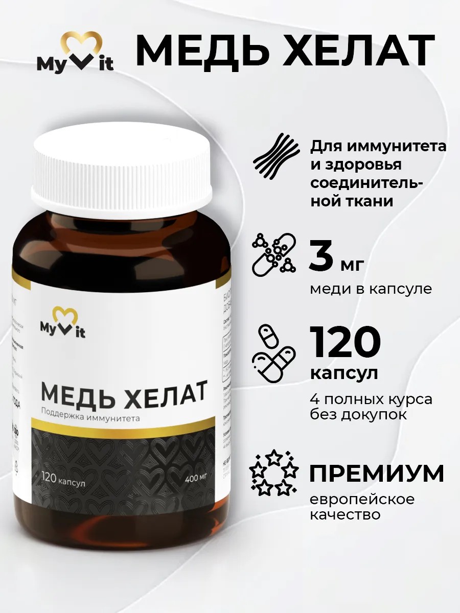 MyVit Copper Bisglycinate Chelate (120 capsules) is an effective dietary supplement for maintaining health. It perfectly combines a vitamin complex including zinc, iron, and copper.