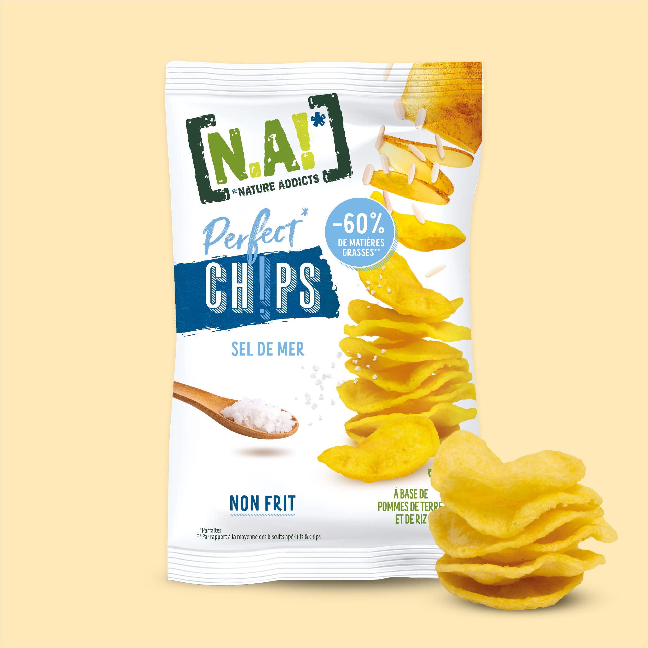 Perfect Chips are made from potato and rice. With 60 less fat than the average snack and crisp, Perfect Chips have it all, and are perfect for sharing! INGREDIENTS Potato 75 , rice flour 14 , corn oil, sea salt, turmeric powder, olive extract. May contain traces of soy and milkN.A!, THE BEST OF NATURE: Since 2009, we have been enhancing essential products with recipes that are as simple as possible, to guarantee you original and, above all, delicious products! We want the best, without compromising between pleasure and a balanced diet, to give you a unique, natural and delicious experience. VARY THE PLEASURES: For an even more delicious healthy aperitif, why not pair Perfect Chips with our Popped Tortillas or our Crisp'Peas (pea puffs)? Just as delicious, they will delight lovers of classic flavors. A TREAT TO SHARE WITHOUT MODERATION: A delicious aperitif has never been so infectious. With 60 less fat than the average snack and crisps, Perfect Chips have it all, and can be shared without moderation!. NATURALLY GOOD: Perfect Chips are made from potato and rice. With salt or seasoned with sweet chili, tomato, and basil, you decide what you prefer. POPPED CHIPS FOR AN ULTRA CRUNCHY APPETIZER: Looking for lighter chips without compromising on deliciousness? N.A! offers you its Perfect Chips, deliciously crispy chips that pop in your mouth. Perfect Chips will enhance your appetizer and delight your guests. Les Perfect Chips sont élaborées à partir de pomme de terre et de riz. Avec 60 de matières grasses en moins que la moyenne des biscuits apéritifs et chips, les Perfect chips ont tout bon, et se partagent sans modération ! INGRÉDIENTS Pomme de terre 75 , farine de riz 14 , huile de maïs, sel de mer, poudre de cucurma, extrait d'olive. Peut contenir des traces de soja et de laitN.A!, LE MEILLEUR DE LA NATURE : Depuis 2009, nous sublimons des produits essentiels grâce à des recettes aussi simples que possible, pour vous garantir des produits originaux et surtout délicieux ! Nous voulons le meilleur, sans compromis entre plaisir et équilibre alimentaire, pour vous faire vivre une expérience unique, naturelle et gourmande à la fois. VARIEZ LES PLAISIRS : Pour un apéro healthy encore plus gourmand, pourquoi ne pas marier les Perfect Chips avec nos Tortillas poppées ou nos Crisp'Peas (soufflés au petit pois) ? Tout aussi délicieux, ils raviront les amateurs de saveurs classiques. UN RÉGAL À PARTAGER SANS MODÉRATION : La gourmandise à l'apéro n'a jamais été aussi communicative. Avec 60 de matières grasses en moins que la moyenne des biscuits apéritifs et chips, les Perfect chips ont tout bon, et se partagent sans modération !. NATURELLEMENT BON : Les Perfect Chips sont élaborées à partir de pomme de terre et de riz. Au sel ou assaisonné au piment doux, tomate et basilic, à vous de décider ce que vous préférez. DES CHIPS POPPEES POUR UN APERO ULTRA CRAQUANT: A la recherche de chips plus légères sans compromettre la gourmandise ? N.A ! vous propose ses Perfect Chips, des chips délicieusement croustillantes qui vous poppent dans la bouche. Les Perfect Chips sauront sublimer votre apéro et ravir vos convives.