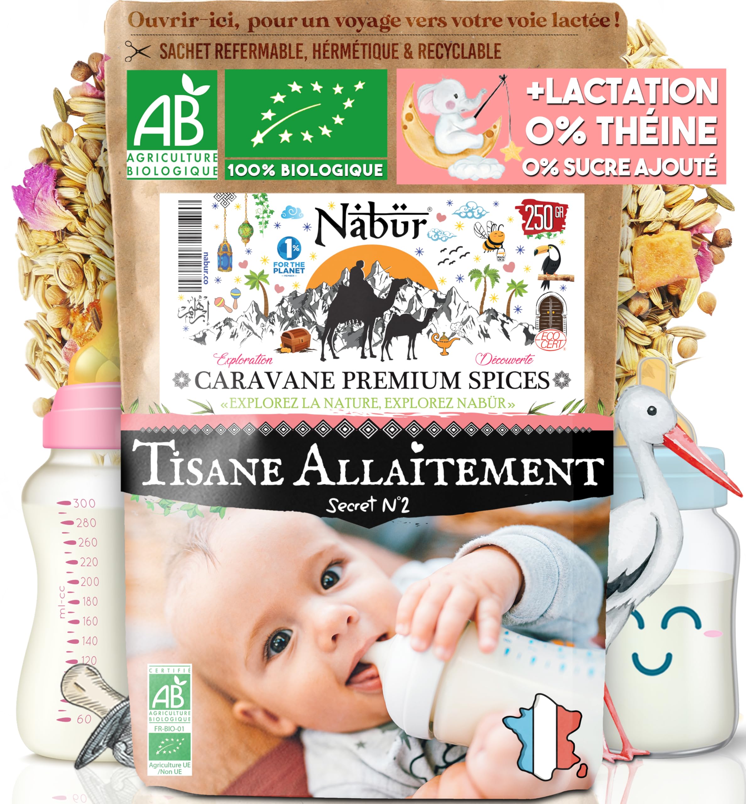 Secret Breastfeeding Herbal Tea No. 2: Stimulation, Lactation, Growth, Joy, Hope. You are a mother and want the best for your baby. You are concerned about healthy eating, for yourself and your infant above all. Breastfeeding your baby. A herbal tea whose not-so-secret recipe can be enjoyed with serenity for daily well-being. Nabür has concocted a colorful, organic herbal tea from the back of his camel, in an economical size to support breastfeeding your baby. A herbal tea whose not-so-secret recipe can be enjoyed with serenity for daily well-being and peace of mind. INGREDIENTS Fennel, Coriander, Caraway, Sweet Apple, Rose Petal, Organically grown INSTRUCTIONS Infuse 2g (tablespoon) in 30cl of boiling water for 5-10 minutes SAFETY WARNING Not applicable See moreNabür - Tisane Allaitement Secret N 2 BIO 250gr Booster 5-en-1 Fenouil, Carvi, Coriandre, Pomme, Rose Lait Maternel, Tisane Lactation, Coliques, 0DESCRIPTION DU PRODUIT DESCRIPTION DU PRODUIT La Tisane Allaitement Secret N 2 : Stimulation, Lactation, Croissance, Joie, Espoir Vous êtes maman et souhaitez le meilleur pour votre bébé. Vous êtes soucieuse d'une alimentation saine, pour vous et votre nourrisson avant tout. L'allaitement de bébé. Une tisane dont la recette pas si secrète se consommera avec sérénité pour un bien-être au quotidien. Nabür a concocté du dos de sa chamelle une tisane colorée, issue de l'agriculture biologique, au format économique pour accompagner l'allaitement de bébé. Une tisane dont la recette pas si secrète se dégustera avec sérénité pour un bien-être et une quiétude quotidienne. INGRÉDIENTS Fenouil, Coriandre, Carvi, Pomme douce, Pétale de rose, issue de l'agriculture biologique MODE D'EMPLOI Infuser 2gr (Cuillère à Soupe), dans 30cl d'eau bouillante, pendant 5 10 minutes AVERTISSEMENT DE SÉCURITÉ Non applicable Voir plus