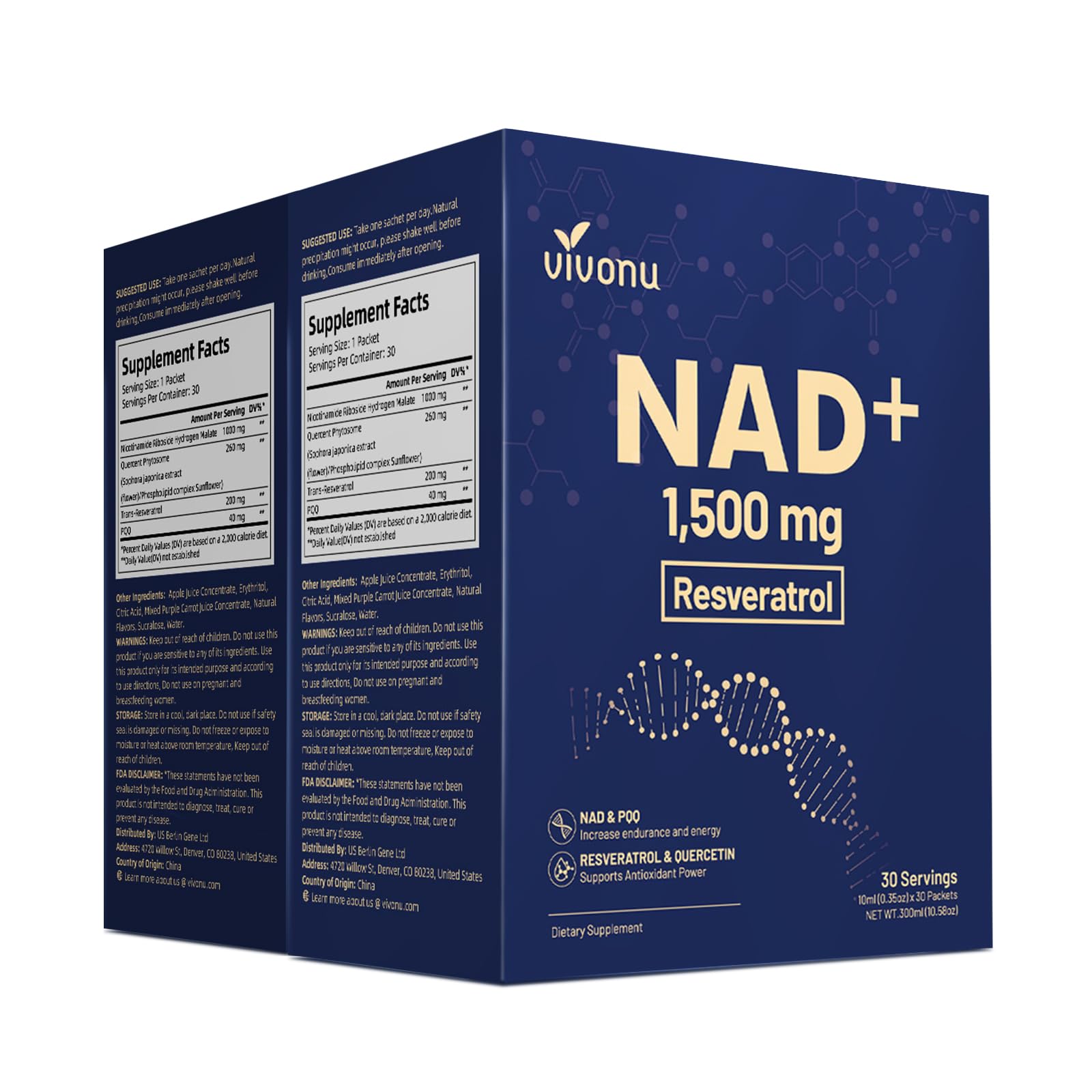 PORTABLE NAD SUPPLEMENTS: Liquid formula, maximum absorption, precise dosage, easy to carry liquid strips (30 strips per box), ready to tear and drink, no need to brew. Designed for fast-paced lifestyles, NAD Cellular Nutritional Supplement integrates seamlessly into daily routines and maintains a steady supply around the clock. HOLISTIC CELLULAR WELLNESS: Pure, Clean Trusted Quality - Made with 100 Natural, NON-GMO, and Gluten-Free ingredients. NAD supplementation supports critical longevity pathways by aiding in DNA repair, sustained energy production, and activation of Sirtuin in the cell nucleus. MEET PEOPLE'S DAILY NEEDS: Our NAD 1500 mg Pure Organic Supplement contains high purity nicotinamide riboside, resveratrol, quercetin botanical capsule, and PQQ to help with brain health, immune defense, and cellular repair. It also activates the sirtuin protein, which helps cells maintain energy production while coping with daily stress. BOOSTS NAD LEVEL: Our NAD promotes DNA repair, This research-backed blend works synergistically to support NAD replenishment while promoting skin vitality and combating oxidative stress at the cellular level, Perfect for anyone Seeking to Stay Sharp, Energized, and youthful. ?VIVONU SUPER NAD SUPPLEMENT: NAD levels naturally decline with age, Our VIVONU Super NAD Supplement - Each serving delivers NAD supplement 1500mg Featuring nicotinamide riboside, trans-resveratrol, Quercetin, and PQQ to support cellular energy, Delivering comprehensive nourishment where your body needs it most.