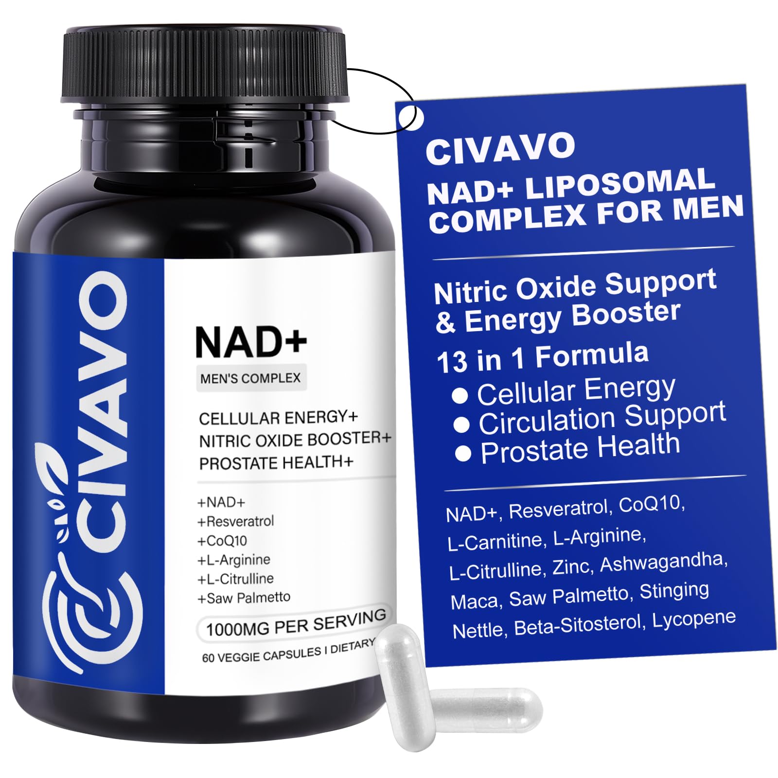 Premium, Clean Formula Made in the USA with non-GMO ingredients, free from gluten, soy, and dairy. Rigorously tested for purity and potency to deliver a trusted men's health supplement for energy, circulation, and cellular renewal. Peak Vitality Without Stimulants Designed for active men, this NAD complex enhances stamina, mental clarity, and post-activity vitality naturally—no artificial stimulants. Ideal for fitness, focus, and daily resilience. Prostate Health Male Wellness The NAD resveratrol supplement Features Saw Palmetto, Stinging Nettle, Beta-Sitosterol, and Lycopene to support prostate health and overall male well-being. This men's wellness complex helps promote confidence and vitality as you age. Boost Nitric Oxide Circulation NAD Supplement 1000 mg formulated with L-Arginine, L-Citrulline, and Zinc, this men's health supplement promotes natural nitric oxide production for improved blood flow, oxygen delivery, and endurance.Civavo NAD Plus supplements Enhanced with Ashwagandha and Maca Root for hormonal balance and sustained energy. Fuel Cellular Energy Vitality This advanced NAD supplement for men combines liposomal NAD , CoQ10, and L-Carnitine to enhance mitochondrial function, support cellular repair, and help reduce fatigue. This NAD supplement Enriched with trans-resveratrol, it provides potent antioxidant protection for long-term vitality.
