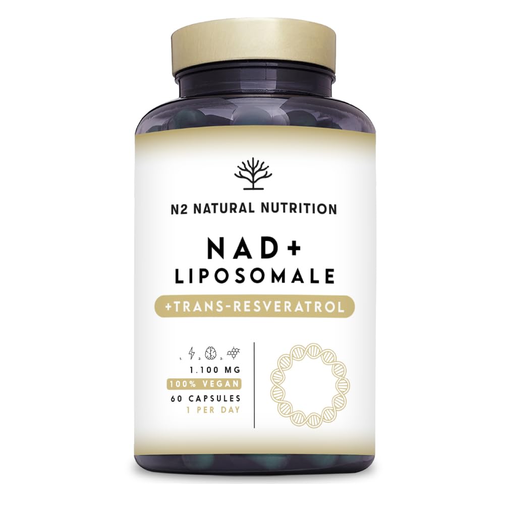 Vegan, natural, and sustainable. 100 natural, vegan formula developed without sugar, gluten, or unnecessary additives. With sunflower lecithin, niacinamide, resveratrol, NAD?, and NAC, this product cares for your health… and the planet. Liposomal technology: 5x greater absorption. Unlike conventional supplements, this liposomal NAD? offers optimal bioavailability for fast and sustained action. Just one capsule a day is enough to support energy, focus, and cell renewal. Daily mental clarity and focus. Thanks to ingredients like NAD?, niacinamide, niacin, and NMN, this formula helps improve cognitive function, memory, and focus. Perfect for demanding lifestyles or periods of cortisol-related stress. Advanced formula with trans-resveratrol and vitamin E. Contains powerful antioxidants like pure resveratrol and vitamin E, which protect cells against oxidative stress and support active, healthy aging. Ideal in synergy with NAD? and niacin. Sustained cellular energy with liposomal NAD?. With 1100 mg per dose, this supplement combines NAD?, niacinamide, NMN, and sunflower lecithin for optimal cellular absorption. An ideal solution to boost your vitality from within and support the natural pathways of NAD.Vegan, naturel et durable Formule 100 naturelle, vegan et développée sans sucre, gluten ni additifs inutiles. Avec lécithine de tournesol, niacinamide, resvératrol, NAD? et NAC, ce produit prend soin de votre santé… et de la planète. Technologie liposomale : absorption 5x supérieure Contrairement aux compléments classiques, ce NAD? liposomal offre une biodisponibilité optimale pour une action rapide et prolongée. Une seule capsule par jour suffit pour soutenir l'énergie, la concentration et le renouvellement cellulaire. Clarté mentale et concentration au quotidien Grâce à des ingrédients tels que NAD?, niacinamide, niacine et NMN, cette formule aide à améliorer les fonctions cognitives, la mémoire et la concentration. Parfaite pour les modes de vie exigeants ou les périodes de stress lié au cortisol. Formule avancée avec trans-resvératrol et vitamine E Contient des antioxydants puissants comme le resvératrol pur et la vitamine E, qui protègent les cellules contre le stress oxydatif et soutiennent un vieillissement actif et sain. Idéal en synergie avec le NAD? et la niacine. Énergie cellulaire durable avec NAD? liposomal Avec 1 100 mg par dose, ce complément associe NAD?, niacinamide, NMN et lécithine de tournesol pour une absorption cellulaire optimale. Une solution idéale pour renforcer votre vitalité de l'intérieur et soutenir les voies naturelles du NAD.NAD Trans Resveratrol 1100 mg. Formule Liposomale avec Nicotinamide Riboside, Niacine et Vitamine E. Boost Métabolisme, Anti-Âge et Réparation Cellulaire. N2 Natural Nutrition