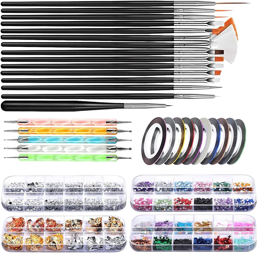 Various Rhinestones for Nails: These flat back nail rhinestones are made of resin, featured with nice shapes and beautiful cutting facets, total 13 colors and the size is 2/3/4mm, different sizes and colors are placed in different grids, gold 3d nail charms are perfect for acrylic nails. Easy to use: how to use these tools? Please follow the instructions below, you can do it easily. Quality: they are made of plastic, seems average but the number of items provided makes up for it. Enjoy your imagination, create whatever you like! : The items were fine for decorating with variety. The brushes were the biggest hit; Sparkly diamonds are small but colorful and Multi-sized; Nail Ribbon sticks well; Beautiful color choices of Paillette Foil Stickers easy to apply, and popular Holographic Butterfly Nail Glitter are also awesome. Great starter kit for nail art tools: Acrylic nail Accessories kit with everything including 15pcs precision nail brush+12 sheets designer nail foil + 10 rollers skinny striping tape + 24 cases pretty little stones+5pcs Mixed sized dotting tools +12 colors butterflies nail sequins.
