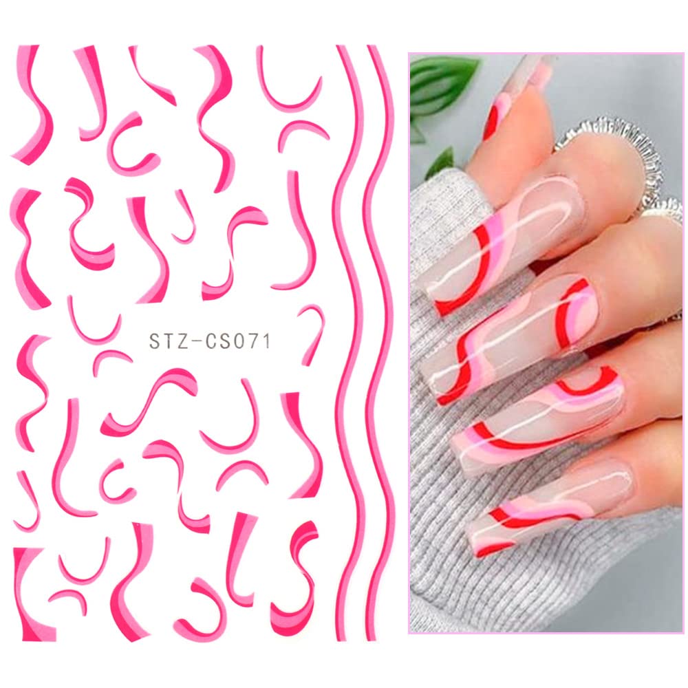 Color: Pink/Blue/Purple/Red. Trait:Gradient Abstract Color Wave Line Design. Type:3D Adhesive Sticker. Size: 9.5x6cm. Design:3D Colorful Wave Line Nail Stickers.