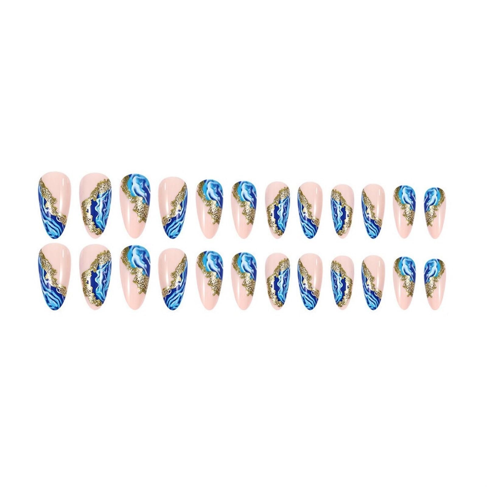 Nail art pieces wearable nail pieces blue marble pattern smudged nail pieces ins wearable false nails nail art patchesNote: After using nail glue, it cannot be reused. Applicable people: women. Color: Blue smudged false nails [jelly glue file]. Style: solid color, style: almond type, pattern: cartoon. Specification: 24 pieces box.