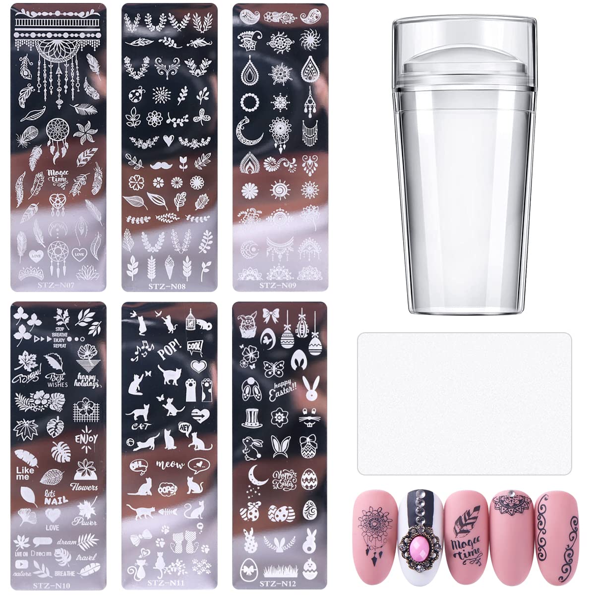 Instructions 1) Remove the protective film 2) Apply nail polish to the desired motif 3) Remove excess nail polish with a scraper below an angle of 45 4) Take the motif with a pounding movement 5) Stamp the motif on your nail with a rolling movement 6) Apply top coat to achieve a longer -lasting result Specification: Color: transparent Material: soft silicone, 100 brand new and high quality Package contents: 6 transparent nail stamps, 1 stamp 1 nail-hot preliminary spectacleMultiple usageIdeal for nail polish, UV gel, art and acrylic nails, etc. also an ideal gift for birthday, Valentine's Day and public holidays.Easy applicationThe plates are deep enough to absorb the polish and transfer it to the stamp to achieve a nice punching result.A variety of patternsEach nail blanket has different patterns: starry sky, animal, flower, heart, constellation, lace, stone, festival, etc. so that you can create unlimited color combinations of nail art design.High quality materialMade of stainless steel, stamp plates are durable enough to be used for a long time.The picture is engraved deep enough to be transmitted well.VALUE PackOur pack contains 6 pieces of rectangular nail stamp templates, 1 piece of stamp and 1 piece of scraper.Anleitung 1) Entfernen Sie die Schutzfolie 2) Nagellack auf das gewünschte Motiv auftragen 3) Überschüssigen Nagellack mit einem Schaber unter einem Winkel von 45 entfernen 4) Nehmen Sie das Motiv mit einer Stampferbewegung auf 5) Stempeln Sie das Motiv mit einer Rollbewegung auf Ihren Nagel 6) Tragen Sie Top Coat auf, um ein länger anhaltendes Ergebnis zu erzielen Spezifikation: Farbe: Transparent Material: Weiches Silikon, 100 nagelneu und hochwertig Packungsinhalt: 6 durchsichtige Nagelstempel, 1 Stempel 1 Nagel-HeißprägeschaberMEHRFACHANWENDUNGeIdeal für Nagellack, UV-Gel, Kunst- und Acrylnägel usw. Auch ein ideales Geschenk für Geburtstag, Valentinstag und Feiertage. Einfache AnwendungDie Platten sind tief genug, um die Politur aufzunehmen und auf den Stempel zu übertragen, um ein schönes Stanzergebnis zu erzielen. VIELFÄLTIGE MUSTERJede Nagelprägeplatte hat verschiedene Muster: Sternenhimmel, Tier, Blume, Herz, Sternbild, Spitze, Stein, Festival usw., damit Sie unbegrenzte Farbkombinationen von Nail Art Design erstellen können. HOCHWERTIGES MATERIALAus rostfreiem Stahl gefertigt, sind Stempelplatten langlebig genug, um lange verwendet zu werden. Das Bild ist tief genug eingraviert, um gut übertragen zu werden. VALUE PACKUnser Pack enthält 6 Stück rechteckige Nagelstempelschablonen, 1 Stück Stempel und 1 Stück Schaber.Nail Art Plates, 6 Stück Nagel Stamping Schablonen mit 1 Stück Transparent Stempel, 1 Stück Schaber, Nail Art Stamping Nail Print Stamper Pflanzen- und Tiermotive Maniküre DIY
