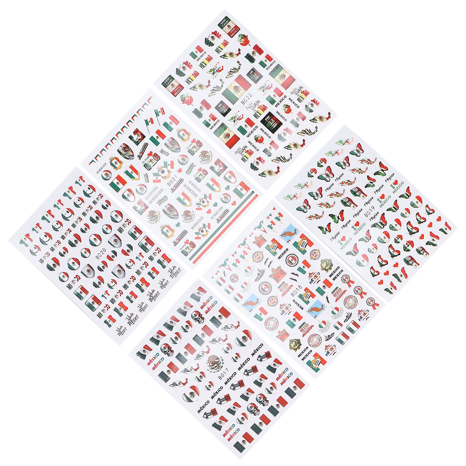 Feature: 1. 6 sheet of Mexican flag nail art stickers, including Mexican flag, heart shape, butterflies, Mexican banner and other patterns. 2. It is self-adhesive, just stick it on the nail, which saves time easily. Similarly, if you want to remove them, just tear them off. 3. Made of eco friendly, skin friendly, non toxic materials. You can use it with confidence. Enjoy the fun of DIY nail art with family or friends. 4. Suitable for decorating various nails, including gel nails, acrylic nails, natural nails, false nails, nail tips, etc. 5. Light weight and in small size, easy to store and carry, can be easily put into your bag, perfect for home use or nail salon. How to Use: 1. Clean the nail surface. 2. Apply nail polish until it is dry. 3. Use tweezers to gently peel the pattern from the backing paper. 4. Paste the pattern on the nail and press the pattern for a few seconds. 5. Apply top coat to the nails to protect the stickers to obtain a long-lasting professional nail art effect, or apply a layer of transparent nail polish. 6. Now you are ready to show off your nails. Specification: Condition: 100% Brand New Item Type: Nail Sticker Quantity: 6 Sheet / Set Uses: Used to create nail art Package List: 6 x Sheet of Nail Sticker INGREDIENTS defaultMade of eco friendly, skin friendly, non toxic materials. You can use it with confidence. Enjoy the fun of DIY nail art with family or friends. 6 sheet of Mexican flag nail art stickers, including Mexican flag, heart shape, butterflies, Mexican banner and other patterns. It is self-adhesive, just stick it on the nail, which saves time easily. Similarly, if you want to remove them, just tear them off. Light weight and in small size, easy to store and carry, can be easily put into your bag, perfect for home use or nail salon. Suitable for decorating various nails, including gel nails, acrylic nails, natural nails, false nails, nail tips, etc.