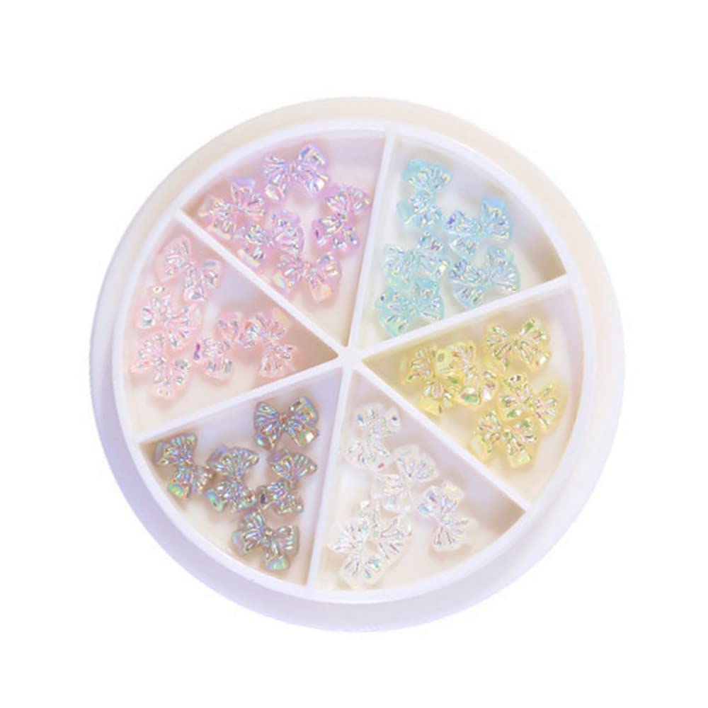 ?Wide Application?Our products are great DIY nail jewelry supplies that you can use to decorate your nails yourself at home. They are suitable for a wide range of applications and are also suitable for decorating mobile phone cases, making handicrafts and much more. ?Perfect Gift?Give the girls the gift of our bows nail decorations and they are undoubtedly the perfect choice. They are so small and delicate that your friend will love them. It will enhance your friendship very well. ?Exquisite Decoration?Our nail studs are very beautiful and stylish. Their crystal clear colours, which remain unchanged in the main body when illuminated by light, reflect a variety of colour variations on the surface, creating an elegant, romantic atmosphere. ?Package?You will get 1 plate of nail art slices. it has 6 compartments and they are all shaped like bows and come in 6 different colours. They are plentiful and enough for your decorating needs. ?High Quality Material?Our nail charms are made of resin, which has good heat resistance, abrasion resistance, pure colour, safety and environmental friendliness.