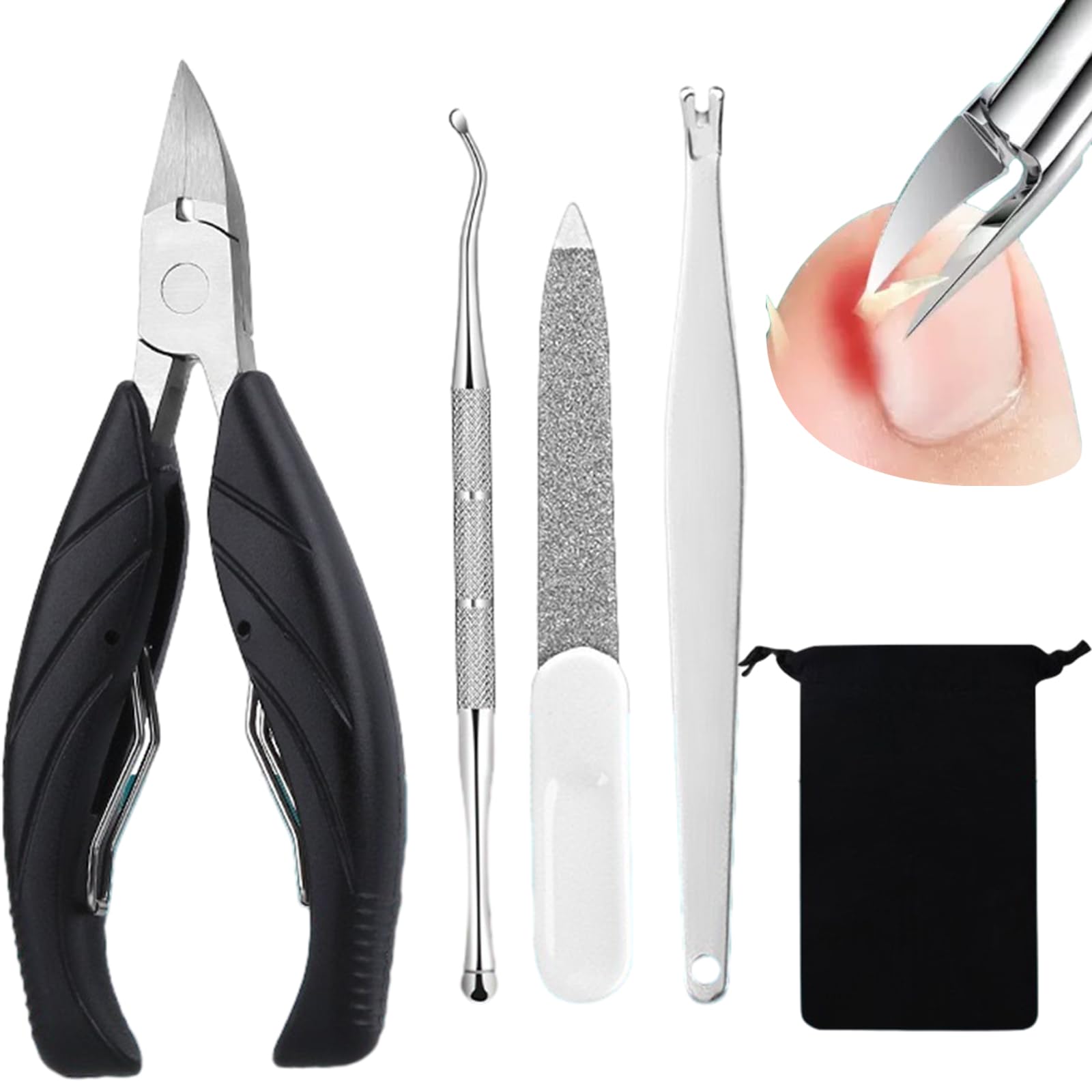 Nail Clipper Set, Toenail Clippers Professional Thick Ingrown Toe Nail Clipper Long Handle Safety Ingrowing Toenail Kit for Thick or Ingrown Toenails?Material?The nail cliper set are made of stainless steel and are durable and do not rust. ?Design?Toenail clippers are easy to grip and apply pressure when cutting. The rubberised design makes the handle non-slip and saves energy. It is perfect for arthritic hands. ?Comfortable?The ergonomic architecture and thick rubber handles are suitable for users' hands and are easy to control during work. This is a very reliable and convenient scissors for those with weak hand strength. ?Sharpness?Hand tempered and sharpened blades ensure precise and clean cutting every time. Tilt to a point, the head effortlessly cuts thick toenails, and even the monster's toenails found no chance of diabetes feet!. ?Package?Comes with 3 pcs toenail tools and 1 pc toenail clippers with 1 pc bag in one package.