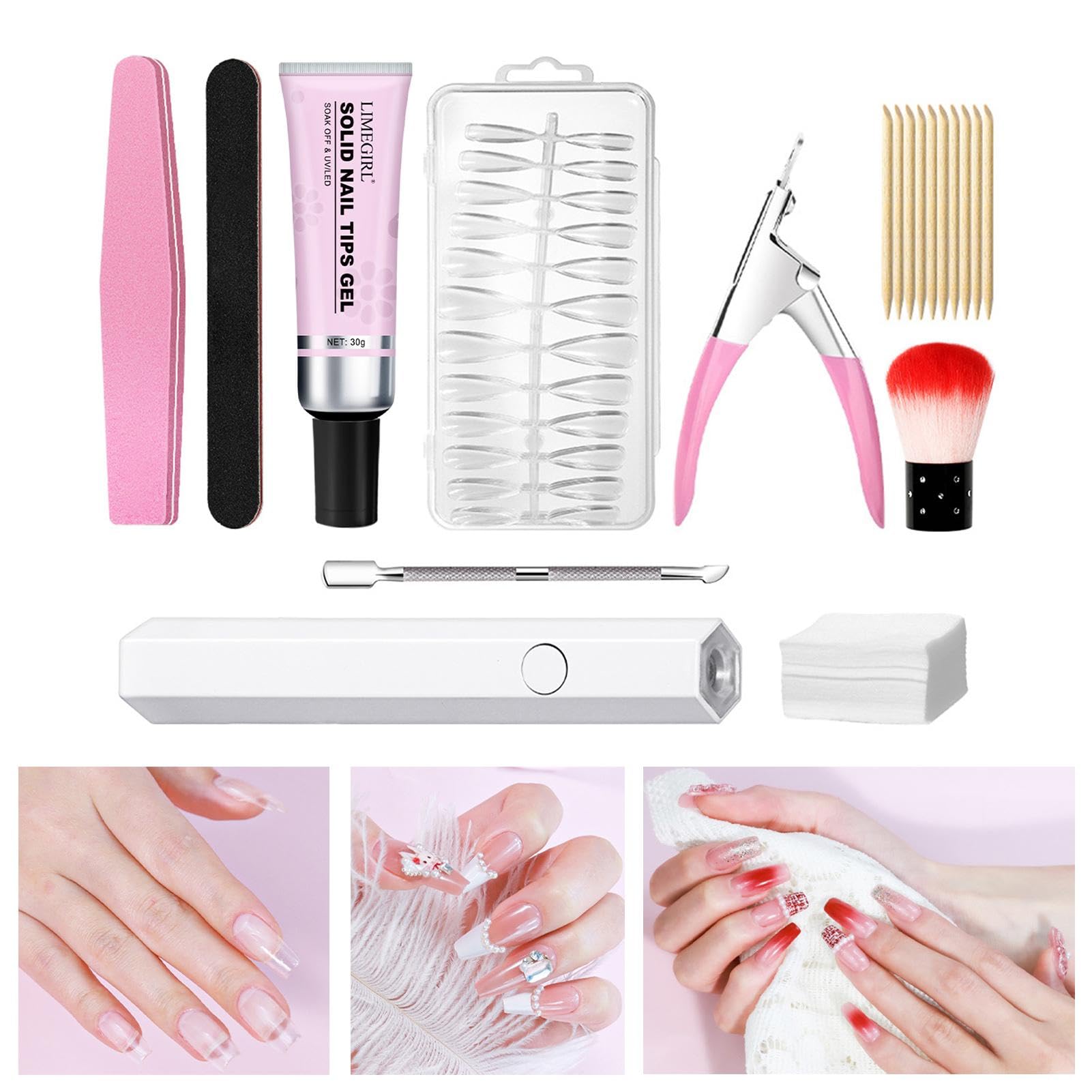 1-Experience Salon-Quality Manicure at The Convenience of Your Home with Our False Nail Tips Kit. 2-Our Artificial Nails Are Easy to Trim, Color and Apply, 3-Providing You with Stylish Look that Lasts for 21 Days. Specification: Nail Gel Net Content: About 30g Product Size: As Shown in The Picture Packing List: Nail Scrub Strip 1 Solid Nail Gel 1 Nail Steel Pusher 1 Nail Steel Pusher 1 Nail Polishing Strip 1 Nail Paint 1 Nail Straight Scissors 1 Piece Extended Nail Tip 100 Nail Orange Wooden Stick 1 Handheld Portable Nail Lamp 1 Note: Due to Different Lighting and Screen Settings, the Item Color May Be Slightly Different from The Picture. Due to Different Manual Measurements, Please Allow 1-2cm Difference in Size.?PROFESSIONAL STYLE: With our gel extension nail kit, you can easily mix and match colors and decorations, while achieving natural look. Trim and apply effortlessly with no risk of color fading. Get stunning and adjustable artificial nails with ease. ?EXTENSIVE APPLICATION: Effortlessly flaunt your natural beauty with this gel extension nail kit. With its elegant extensions, it's perfect for daily use, weddings, parties, or even on your next traveling business trip. Ideal for anyone and any occasion. ?UNIQUE PRESENT: Celebrate special occasions with our gel extension nail kit, perfect Christmas, birthday, or Valentine's Day present. This effortless beauty process is also an excellent Mother's Day that raises confidence levels and elevates style. ?SAFE AND COMFORTABLE: Our gel extension nail kit ensures manicure experience that is both safe and comfortable due to its top-grade ABS material, which is odorless and ensures lasting reliability. ?LONG-LASTING BEAUTY: Achieve gorgeous nails with ease using our gel extension nail kit that provides excellent adhesion and durability for over 3 weeks. Perfect for applying artificial nails, rhinestone embellishments, gold or other stylish nail decorations.
