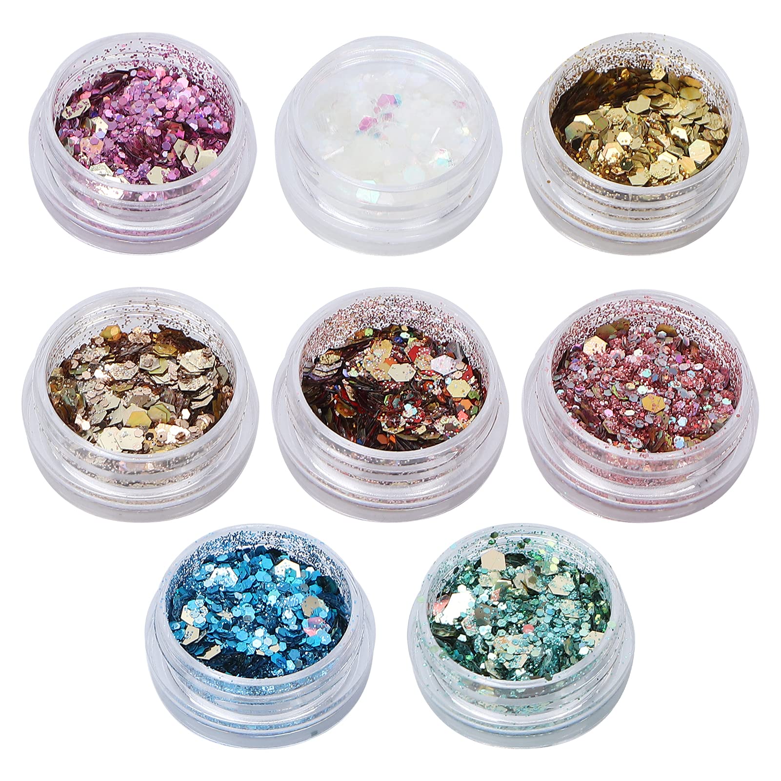 Mixed nail sequins, the color will change when viewed from different light and angles. You can also apply it on your eyes, face and body parts to make your body shiny. Suitable for salon or home use, shiny sequins can meet your diversified needs for nail decoration. Made of high-quality materials, durable, reliable, and safe enough to not hurt your nails. 8 different colors, all packed in jars, with good airtightness and preventing overflow, which can meet your various decoration needs.