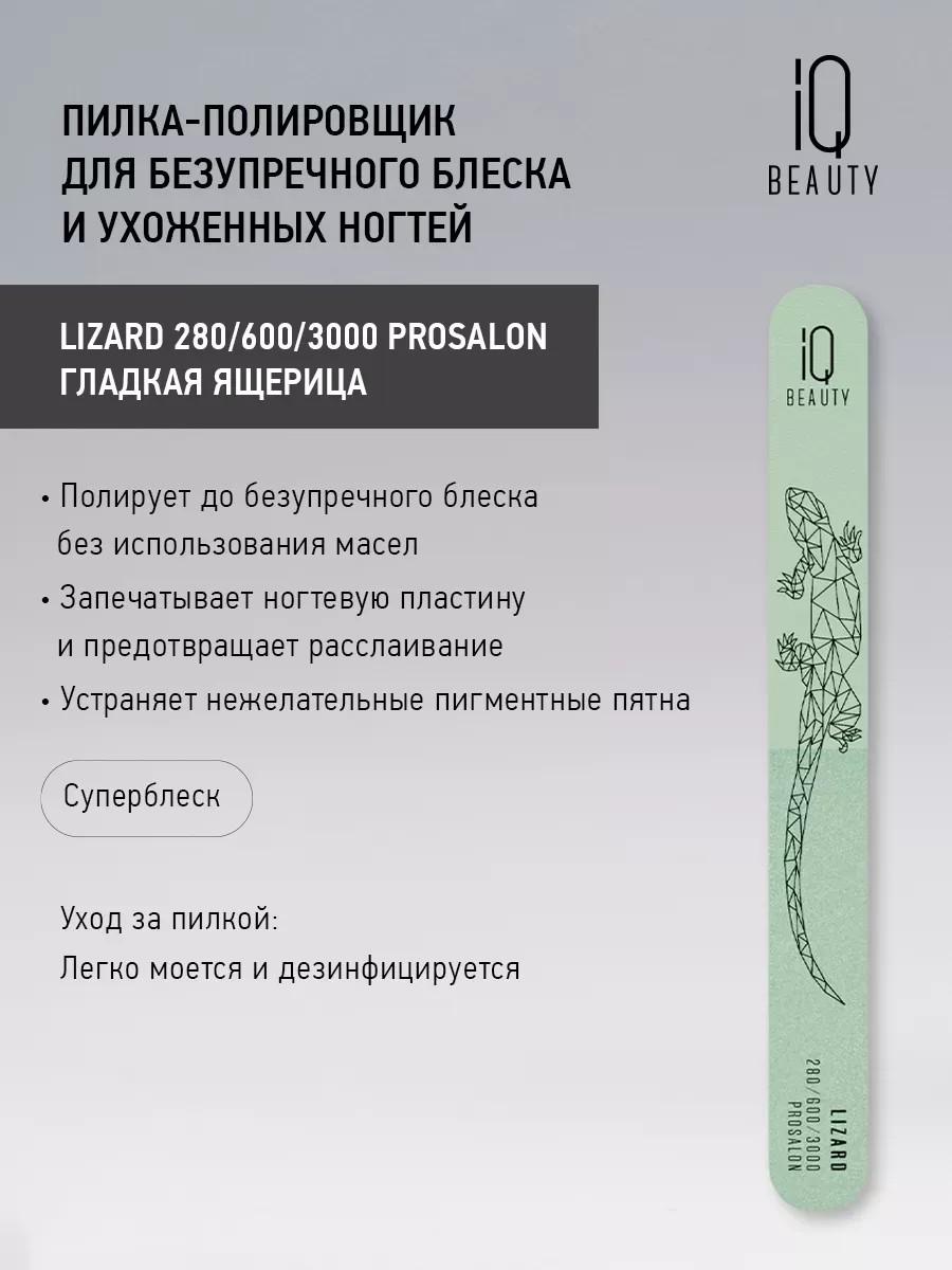 Пилка для ногтей «Сияющая Ящерица» линейки Prosalon – это инструмент профессионального качества подходит как для домашнего, так и для салонного использования. Она полирует ногти до безупречного блеска без использования масел, запечатывает ногтевую пластину и предотвращает расслаивание, а также эффективно устраняет нежелательные пигментные пятна. Долговечное безопасное покрытие и основа Long Life File придаёт пилке отличные эксплуатационные качества. Её абразив не осыпается, не крошится, устойчив к истиранию, а основа не заламывается, не лопается, не деформирует рабочую поверхность. Lizard - мультифункциональная пилка, т.к. стороны с разным абразивом позволяют решить несколько задач в маникюре и педикюре. Стильный дизайн с тотемным животным подскажет функцию пилки. Уход за пилкой: пилка Lizard 280/600/3000 легко моется и дезинфицируется.