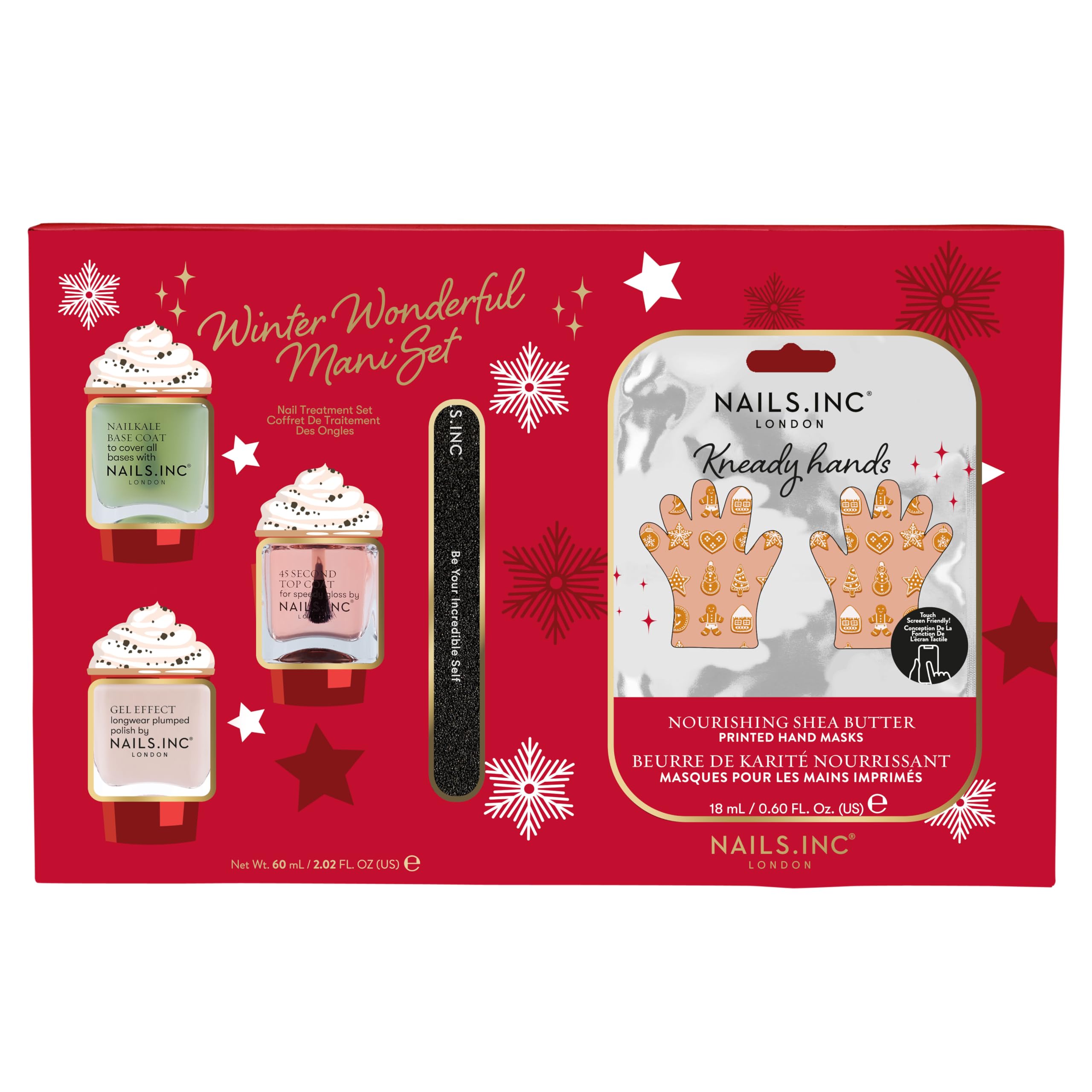 Your nails deserve a treat this festive season! That's where this kit comes in, primed and ready to rescue with treatments and nail remedies. Get stronger nails, from base coat to top coat, and super-smooth skin to boot. Festive tips and toes, this way! Each can be applied easily to create an immaculate finish, using the patented, wide hugging brush exclusive to Nails.INC, ergonomically designed to work with the shape of the nail and minimize the number of strokes required. INGREDIENTS Nail Kale BUTYL ACETATE, ETHYL ACETATE, NITROCELLULOSE, ACETYL TRIBUTYL CITRATE, ADIPIC ACID NEOPENTYL GLYCOL TRIMELLITIC ANHYDRIDE COPOLYMER, ISOPROPYL ALCOHOL, ACRYLATES COPOLYMER, STEARALKONIUM BENTONITE, ALOE BARBADENSIS LEAF EXTRACT, PHOSPHORIC ACID, BENZOPHENONE-1, BENZOGUANAMINE, BIOTIN, CAPRYLIC CAPRIC TRIGLYCERIDE, BRASSICA OLERACEA ACEPHALA (KALE) LEAF EXTRACT, CITRUS LIMON (LEMON) FRUIT EXTRACT, AQUA (WATER), ZINC ACETYLMETHIONATE, PANAX GINSENG ROOT EXTRACT, GLYCERIN, GLYCERYL STEARATE, GLYCERYL LINOLENATE, GLYCERYL LINOLEATE, GLYCERYL OLEATE, GLYCERYL PALMITATE, HEXANAL, PUNICA GRANATUM SEED OIL, GLYCINE SOJA (SOYBEAN) OIL , LAURALDEHYDE, MAGNESIUM ASCORBYL PHOSPHATE, ISOPROPYL MYRISTATE, CALCIUM PANTOTHENATE, PISTACIA LENTISCUS (MASTIC) GUM, POLYVINYL BUTYRAL, PROPYLENE GLYCOL, VITIS VINIFERA (GRAPE) FRUIT EXTRACT, RETINYL PALMITATE, STYRENE ACRYLATES COPOLYMER, SODIUM BENZOATE, HELIANTHUS ANNUUS (SUNFLOWER) SEED OIL, TRIMETHYLPENTANEDIYL DIBENZOATE, TOCOPHEROL, TOCOPHERYL ACETATE, FERRIC, CI 77510 (AMMONIUM FERROCYANIDE), CI 19140 (YELLOW 5 LAKE). 45 Second Top Coat ETHYL ACETATE, BUTYL ACETATE, ALCOHOL DENAT, CELLULOSE ACETATE BUTYRATE, ACETYL TRIBUTYL CITRATE, DIPROPYLENE GLYCOL DIBENZOATE, ACRYLATES COPOLYMER, ETOCRYLENE CAPRYLIC CAPRIC TRIGLYCERIDE, HEXANAL LAURALDEHYDE, LACTOBACILLUS FERMENT, AQUA (WATER, EAU), RETINOL, CALCIUM PANTOTHENATE, ZINC ACETYLMETHIONATE, RUBUS IDAEUS (RASPBERRY) LEAF EXTRACT, BHT, TOCOPHEROL, COLLAGEN, LEUCONOSTOC RADISH ROOT FERMENT FILTRATE, BENZOGUANAMINE, SODIUM BENZOATE, CI 26100 (RED 17), CI 60725 (VIOLET 2). Sprinkled with Love BUTYL ACETATE, ETHYL ACETATE, NITROCELLULOSE, ADIPIC ACID NEOPENTYL GLYCOL TRIMELLITIC ANHYDRIDE COPOLYMER, ACETYL TRIBUTYL CITRATE, ISOPROPYL ALCOHOL, ACRYLATES COPOLYMER, N-BUTYL ALCOHOL, ALUMINUM HYDROXIDE, PHOSPHORIC ACID, BENZOGUANAMINE, CAPRYLIC CAPRIC TRIGLYCERIDE, BRASSICA OLERACEA ACEPHALA (KALE) LEAF EXTRACT, DIACETONE ALCOHOL, WATER (AQUA, EAU), ZINC ACETYLMETHIONATE, HEXANAL, HYDRATED SILICA, HYDROGEN DIMETHICONE, LAURALDEHYDE, OCTOCRYLENE, SILICA, SODIUM HYALURONATE, SODIUM BENZOATE, STEARALKONIUM BENTONITE, TITANIUM DIOXIDE (NANO), TOCOPHEROL, CI 77491 (IRON OXIDES), CI 19140 (YELLOW 5 LAKE). SAFETY WARNING For external use only. Avoid contact with eyes. Keep away from naked flame or direct heat sources. See moreContains: Kneady Hands hand mask, NailKale base coat, Sprinkled With Love (Nude nail polish), 45 Second top coat and Nails.INC nail file. Festive tips and toes, this way!. Each can be applied easily to create an immaculate finish, using the patented, wide hugging brush exclusive to Nails.INC, ergonomically designed to work with the shape of the nail and minimize the number of strokes required. Get stronger nails, from base coat to top coat, and super-smooth skin to boot. Your nails deserve a treat this festive season! That's where this kit comes in, primed and ready to rescue with treatments and nail remedies.