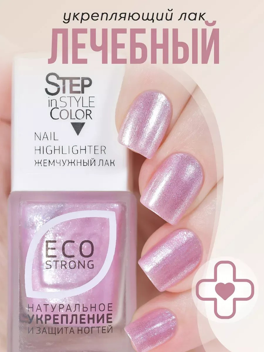 Step in Style Nail Highlighter ECO Strong 36 is a lilac-pink translucent base with a pearlescent finish that's easy to apply and looks great on nails of any length and shape. Its texture ensures even coverage and dries quickly in the air like regular polish—no lamp required. You can easily groom your hands at home, without wasting time at the salon. Step in Style's color-coated treatment provides reliable protection, gradual strengthening, and gentle restoration, while also stimulating natural nail growth. The formula contains proven strengthening ingredients that seal fragile, damaged nails and restore flexibility and a healthy shine. For comprehensive care and restoration, use the product as a course, applying regularly for a month. The 11 ml bottle is sufficient for numerous applications. The photos show the shade applied in two coats. A manicure with this shade will harmoniously complement any look. HOW TO USE: Before applying the treatment polish, be sure to clean and degrease the nail plate. Finish the treatment with a top coat, if desired, and seal the tips to maintain a flawless look for as long as possible. Use it for a manicure or pedicure: the durable texture lasts long on both hands and feet, but can be removed with any nail polish remover. This little surprise will be a delight for any girl: it's a perfect gift for March 8th, New Year's, a birthday, or just because, for any occasion. The brand's products are manufactured using a safe, eco-friendly formula (Big5Free), are certified, and are not tested on animals.