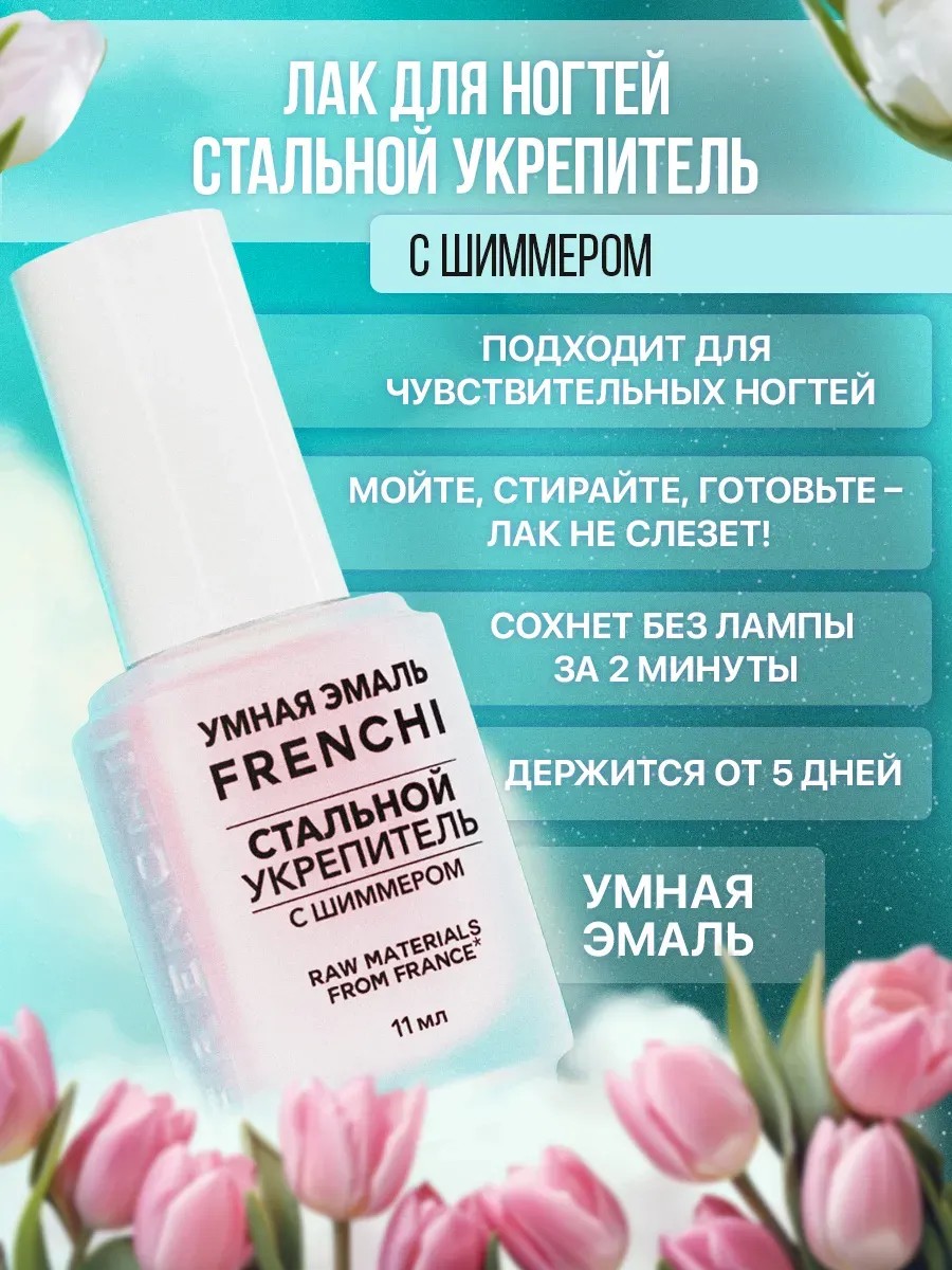 Лаки для ногтей без лампы Умная эмаль Frenchi- идеальное укрепляющее средство на основе натуральных компонентов (экстракт лимона, экстракт красной водоросли, витамин C).Лак для ногтей нюдовый укрепляющий сочетает в себе квинтэссенцию лучших качеств по уходу за ногтевой пластиной: укрепитель ногтей сохнет без лампы. Придает ногтям прочность за счет содержания железа в составе, прекрасно увлажняет и питает, а также предотвращает расслаивание и способствует росту. Проверенная годами формула 21 FREE безопасна и не содержит формальдегид. Укрепитель представлен в двух цветах- розовый и нюдовый с шимером. Средство выполняет функцию гель-лака, выравнивая поверхность ногтя и маскируя видимые недостатки. Стойкий простой лак Френчи-укрепление для ногтей без лампы. Ногти выглядят крепкими и здоровыми уже после первого применения. Лак обычный быстросохнущий светлый стальной укрепитель придает ногтям здоровый, естественный вид. Флюид-формула обеспечивает легкое и равномерное нанесение. Заметно более крепкие и здоровые ногти после 1 применения. Не железный укрепитель, но абсолютная защита от агрессивного ежедневного воздействия. Лак для ногтей цветной нюдовый полупрозрачный. Способ применения: Нанесите 1-2 тонких слоя Стального укрепителя на чистую, сухую ногтевую пластину. Повторяйте процедуру не чаще 2-х раз в неделю. Лечебный лак для ногтей восстанавливает, выравнивает поверхность пластины. Ногти приобретают здоровый ухоженный вид. Умная эмаль для ногтей укрепляющая - это отличное средство для достижения крепких и здоровых ногтей. Лак для ногтей прозрачный светло- розовый обеспечивает уникальное сочетание лака и укрепителя в одном продукте. Укрепитель для ногтей после наращивания создет безупречный маникюр и педикюр и улучшает состояние ногтя. Лак блестящий глянцевый быстро сохнет действует, как пленка, даря им крепость и защиту. Профессиональная косметика, стимулирует рост ногтевых пластинок, делая их более устойчивыми и менее ломкими.