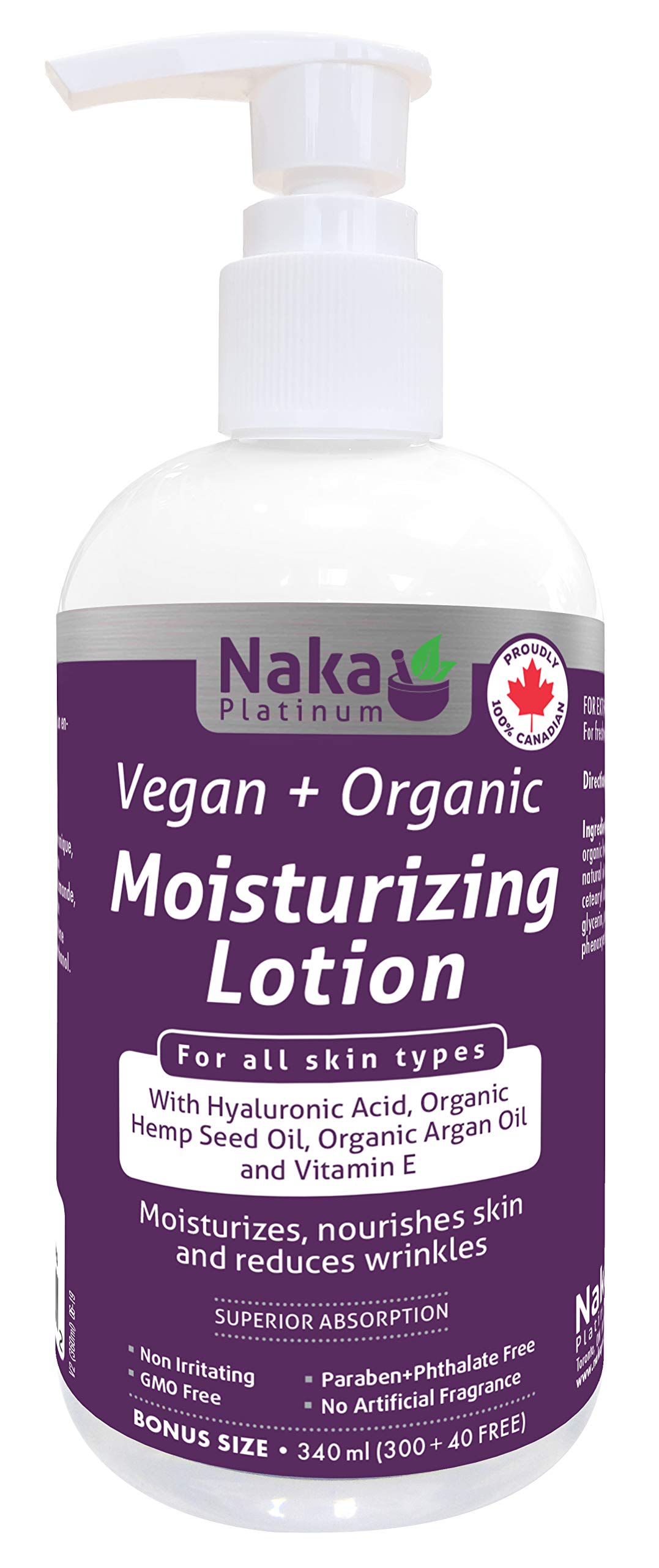 Naka Platinum Vegan+Organic SUPERIOR ABSORPTION MOISTURIZING LOTION with Hyaluronic Acid Organic Hemp Seed Oil Organic Argan Oil and Vitamin E - BONUS SIZE 340 ml (300+40 FREE)