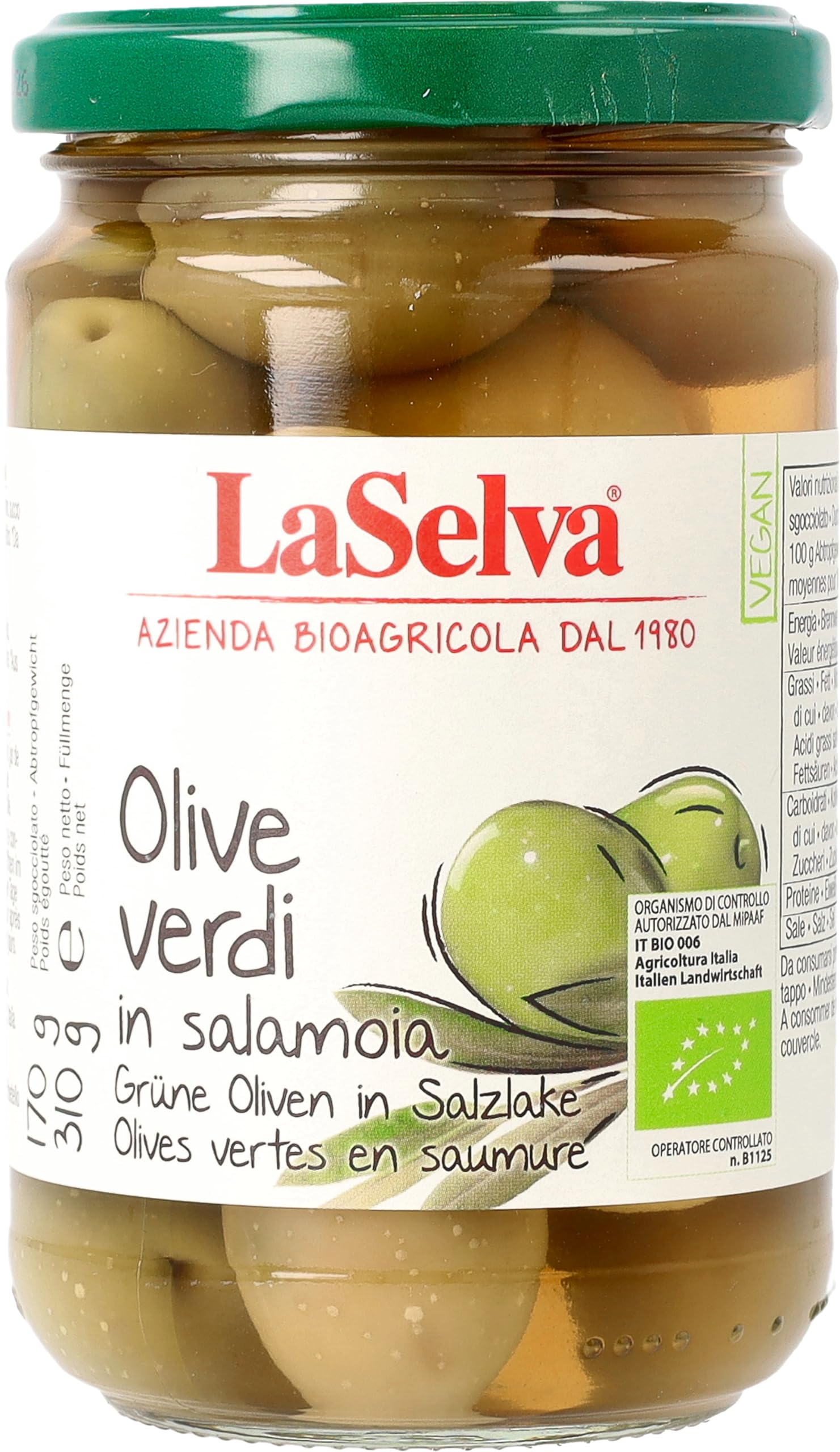 LaSelva 8018759001300 Olives Vertes en Saumure Bio 310 g