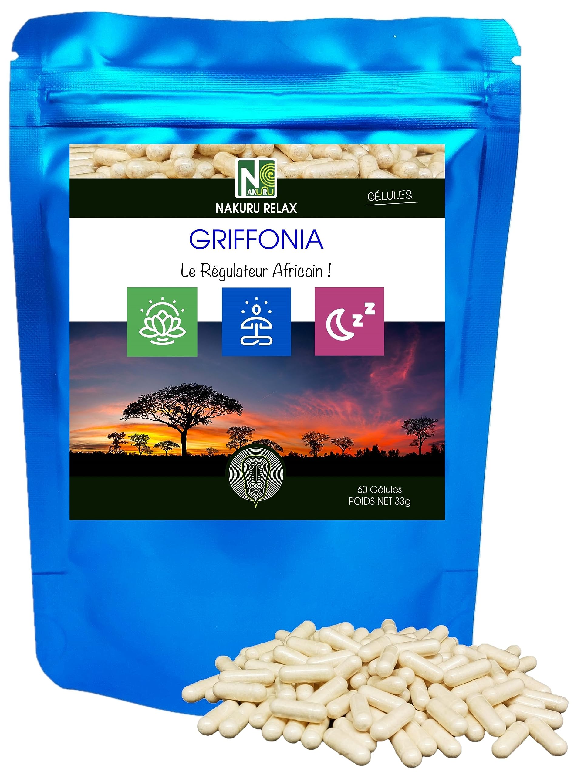 NAKURU | Griffonia | Relax Range | Made in France | The African Regulator! (60 Vegetable Capsules of 550 mg/Net Weight: 33 g)