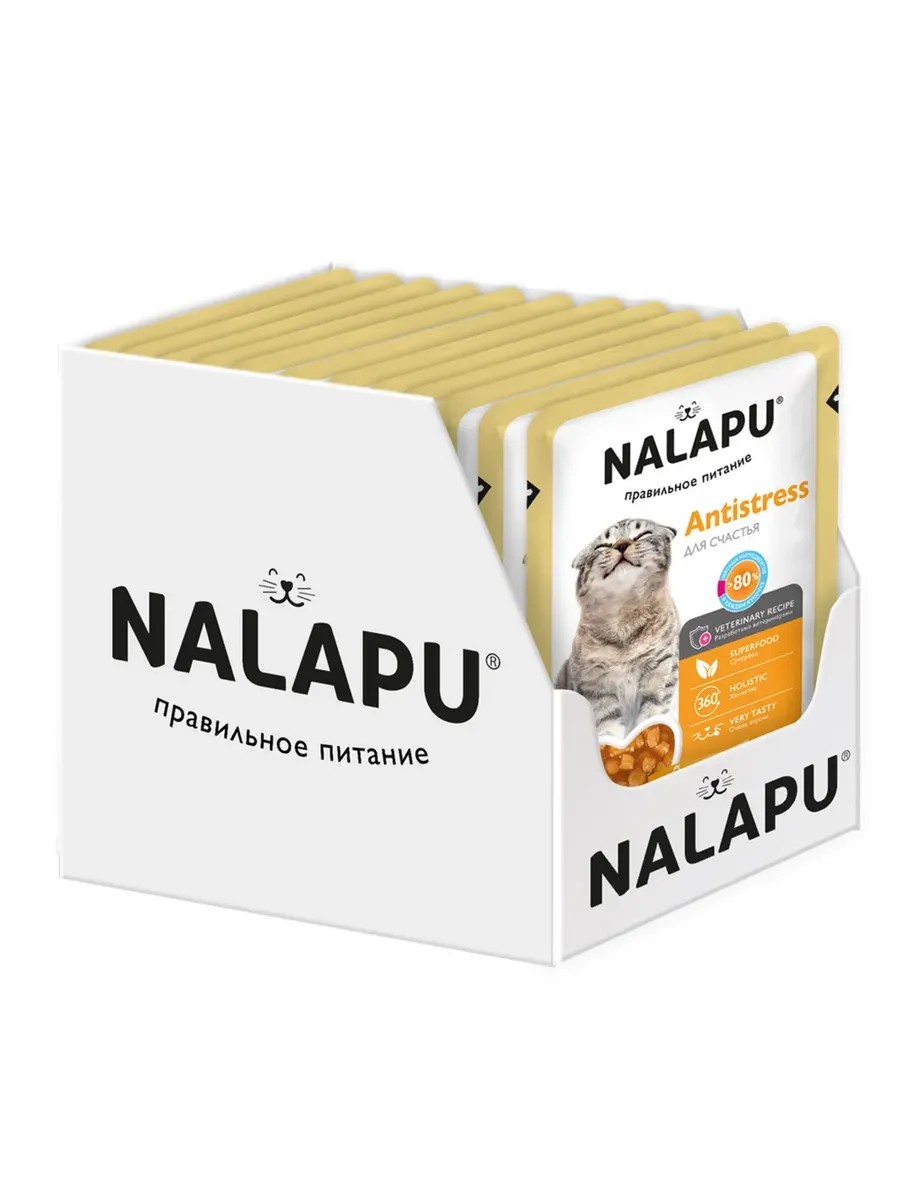 | Полное наименование товара | Корм влажный для кошек NALAPU Antistress ломтики курицы в желе 77гр х 24шт |
