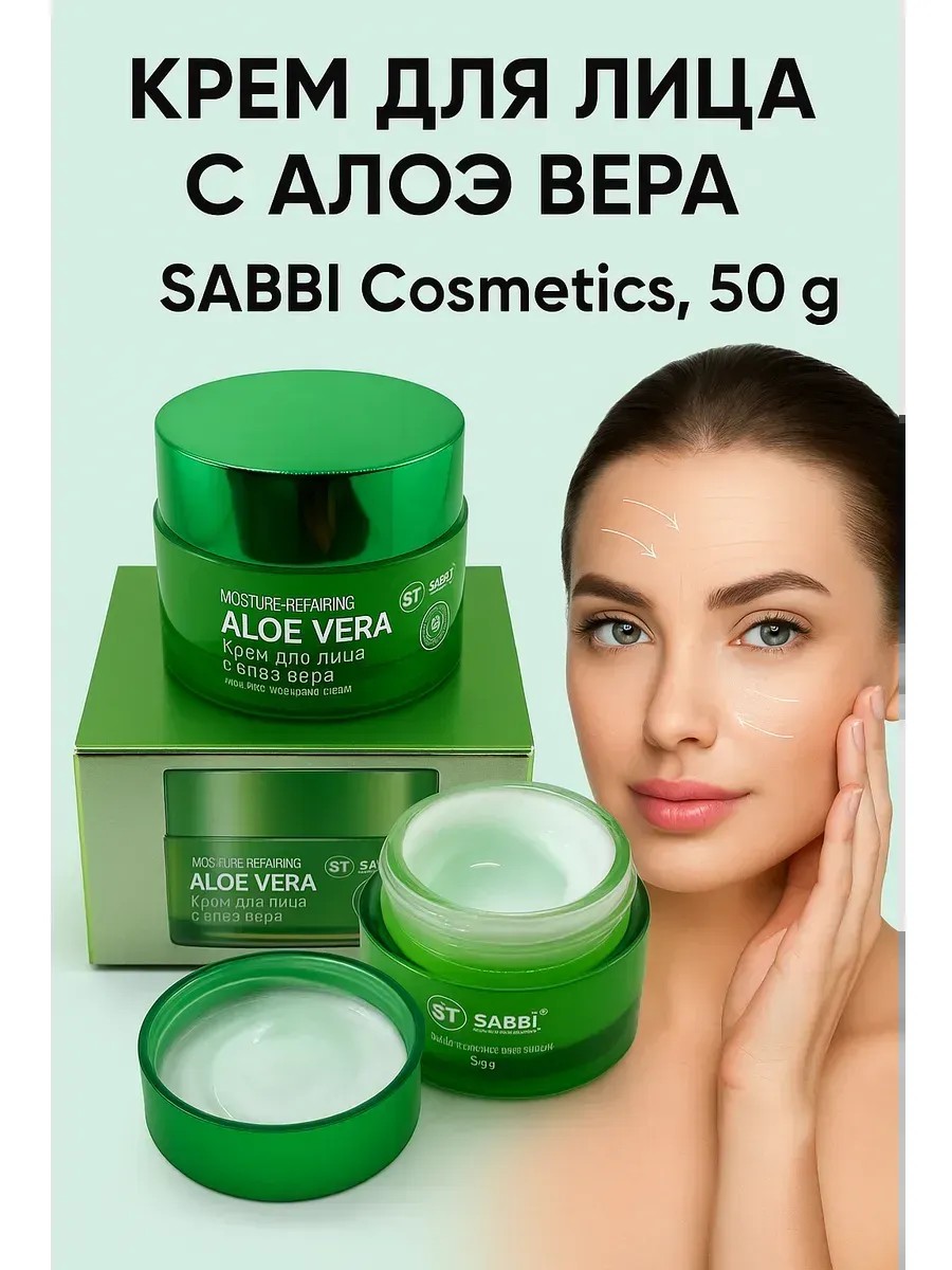 Это увлажняющий крем для лица с алоэ вера SABBI Cosmetics, объёмом 50 г — идеальное решение для ежедневного ухода за сухой, чувствительной и проблемной кожей. Благодаря высокой концентрации экстракта алоэ вера, мазь глубоко увлажняет, питает и восстанавливает кожу, снимая раздражение и покраснение. Увлажняющий крем для лица подходит для всех типов кожи, включая жирную и комбинированную. Он быстро впитывается, не оставляя липкости и жирного блеска. Гель алоэ вера имеет лёгкую гелевую текстуру и натуральный состав, не содержит парабенов и агрессивных компонентов.