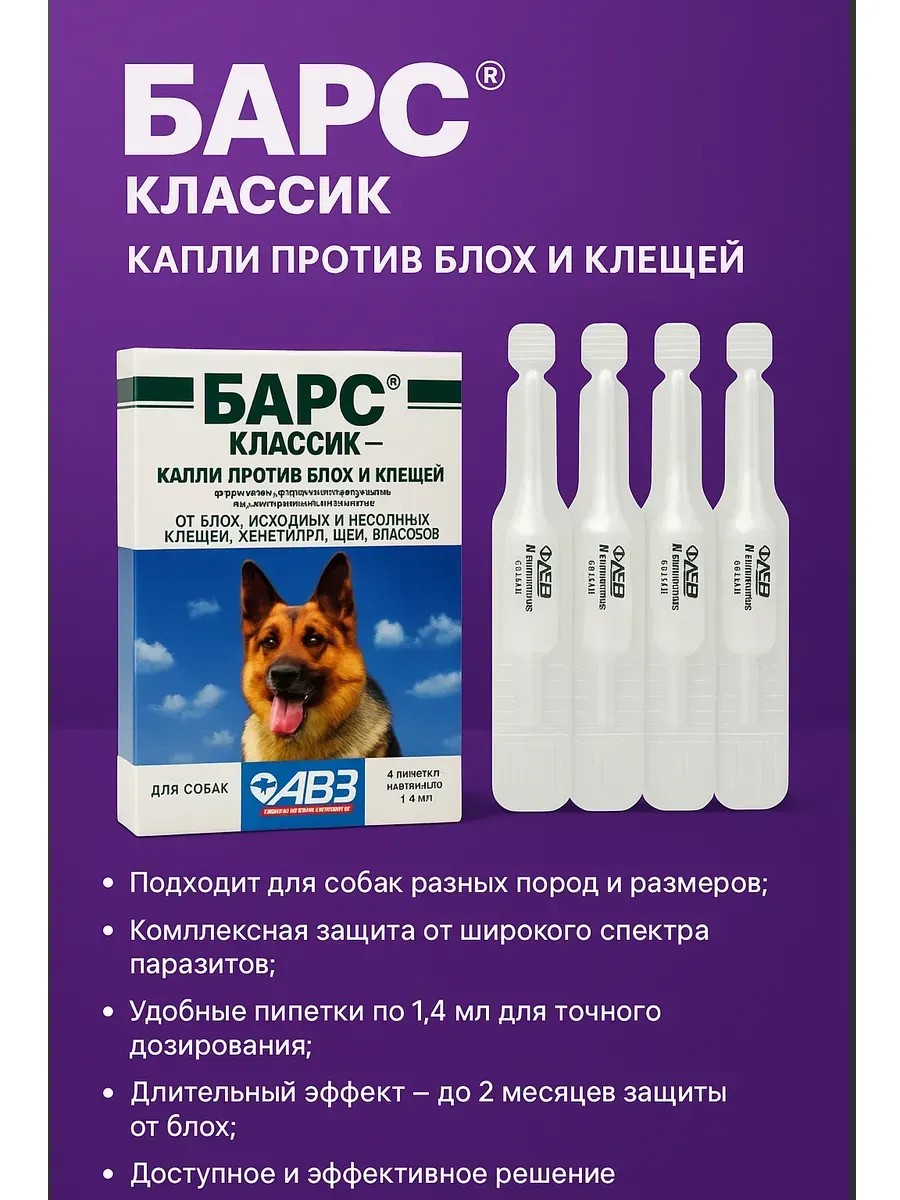Капли Барс Классик (4 пипетки по 1,4 мл) – это надёжное средство для защиты собак от блох, клещей, власоедов, вшей и других паразитов. Ветеринарный препарат разработан специально для комплексной профилактики и лечения, обеспечивая защиту питомца на длительный срок. Благодаря проверенной формуле и удобной форме выпуска, эти капли подходят для разных пород и размеров, помогая заботиться о здоровье и комфорте вашего любимца.